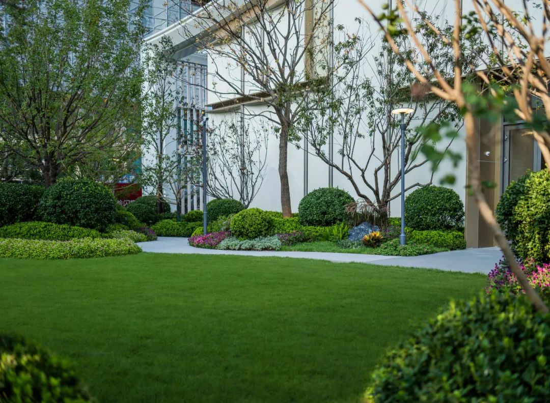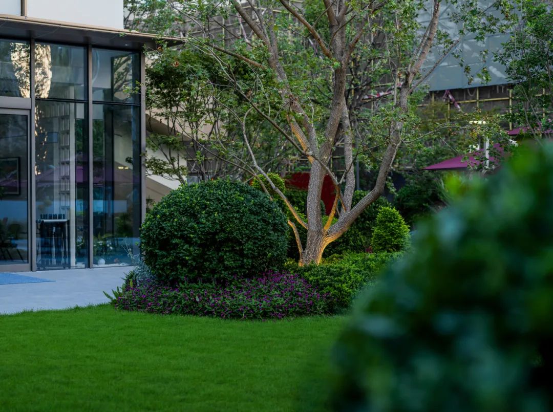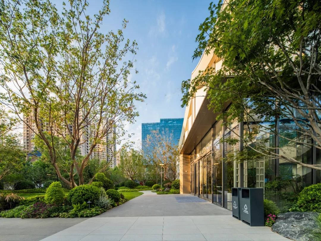 随一条石板小径引向建筑入口,空间流动,开合有致,建筑半露半藏,若隐若现。漫步于林荫下,花境间,树影婆娑,林隐林舒。后豁然开朗,面对开阔草坪,见阳光洒向建筑,掩映于绿意之间。