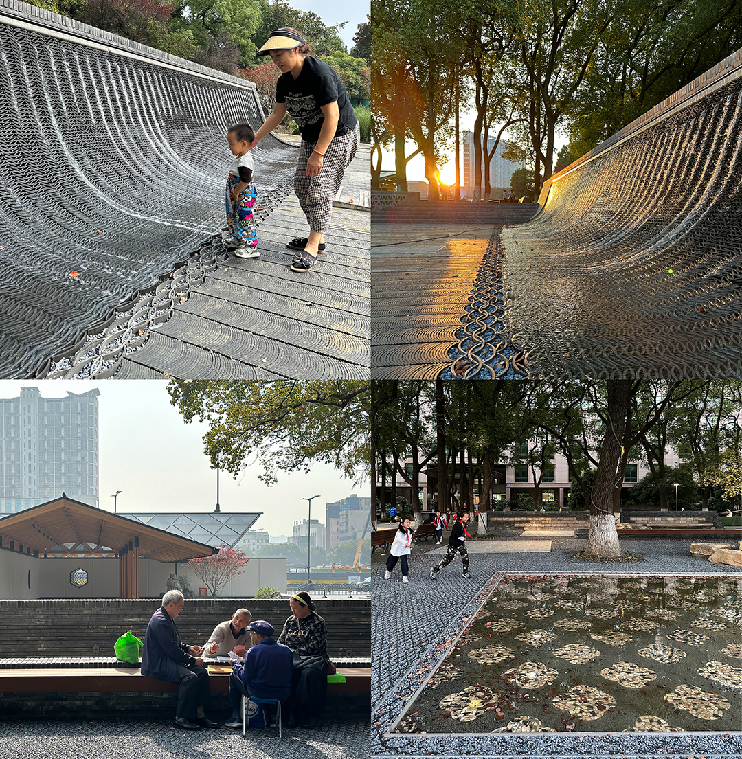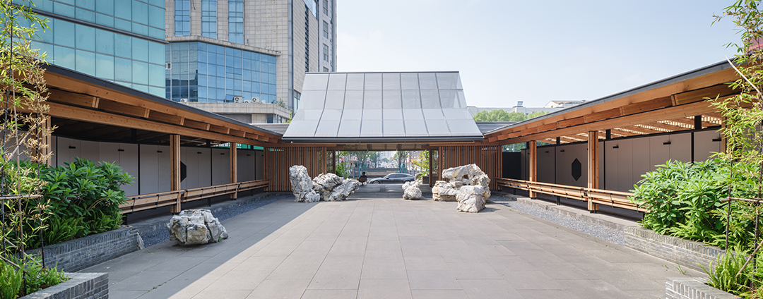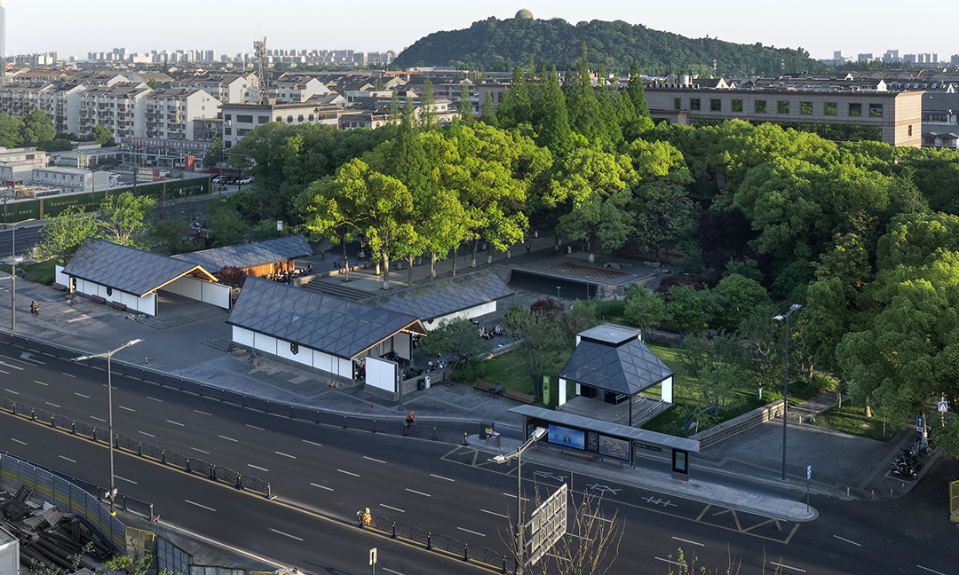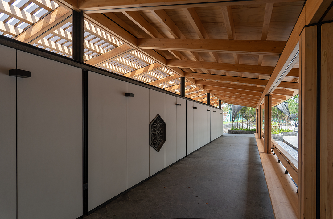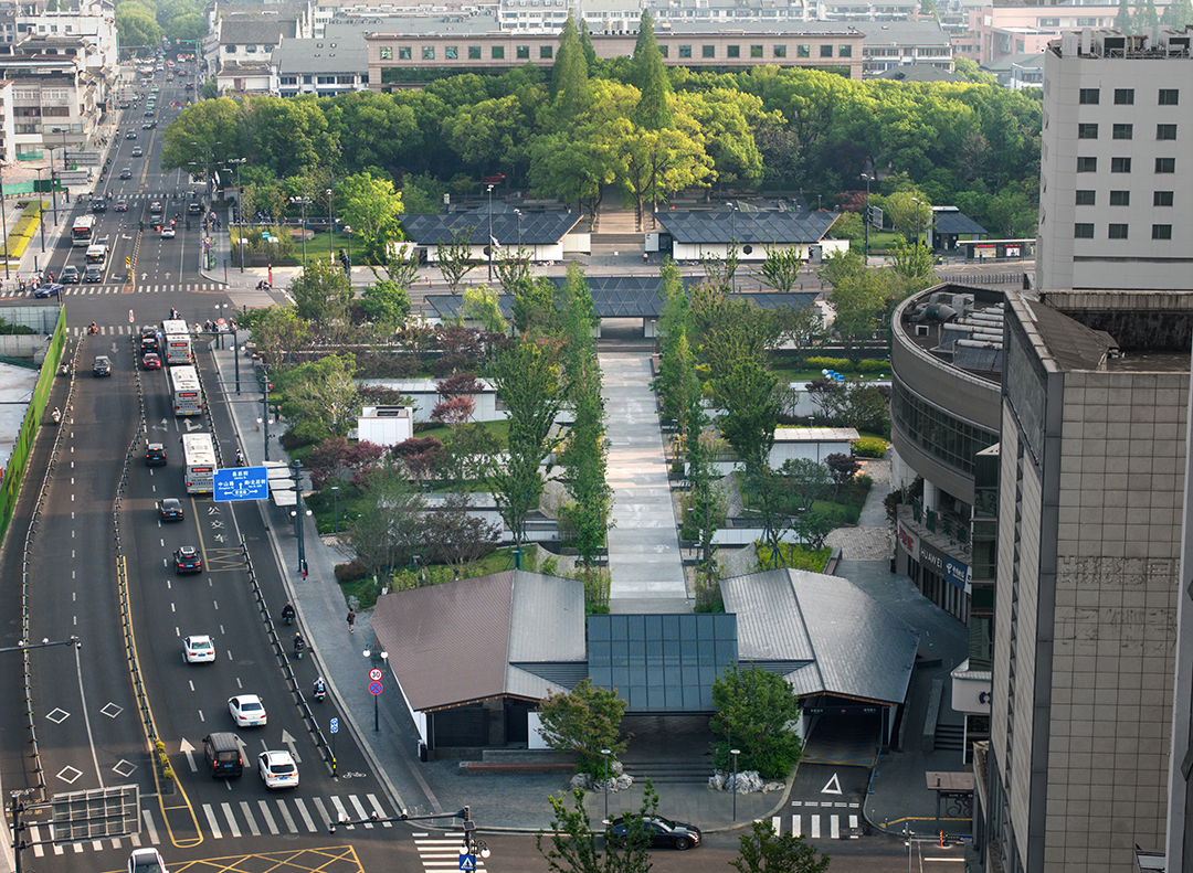 步行轴线在南端与人民路交汇。一组坡顶木构的休息廊在此整合了地铁的地上设备区和地下车库出口,形成轴线南端的收束。至此,这条昆山城历史上重要的地理标识再次展露于世人眼前。