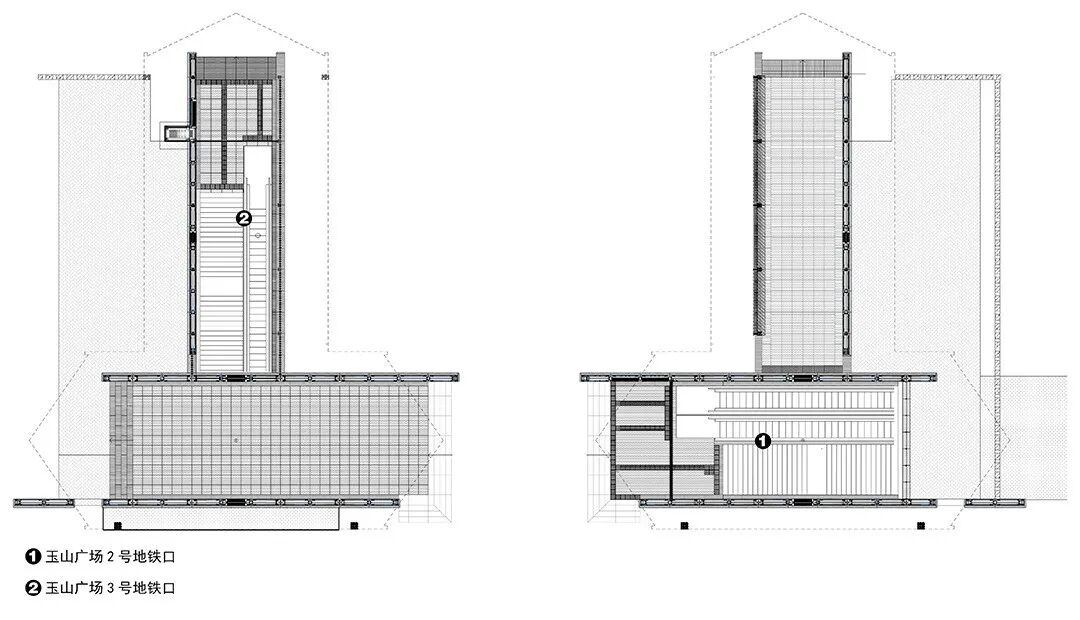 玉山广场地铁站口也分为南、北两组,北区为已经通车启用的S1线4个地面出入口(含1个无障碍电梯出入口),分布于前进中路南、北两侧。南区是为未来K1线提供的地面出入口及风井设施,以及轴线南端的“U”形休息廊,它们共同形成了玉山广场中轴步道上的节点建(构)筑群。