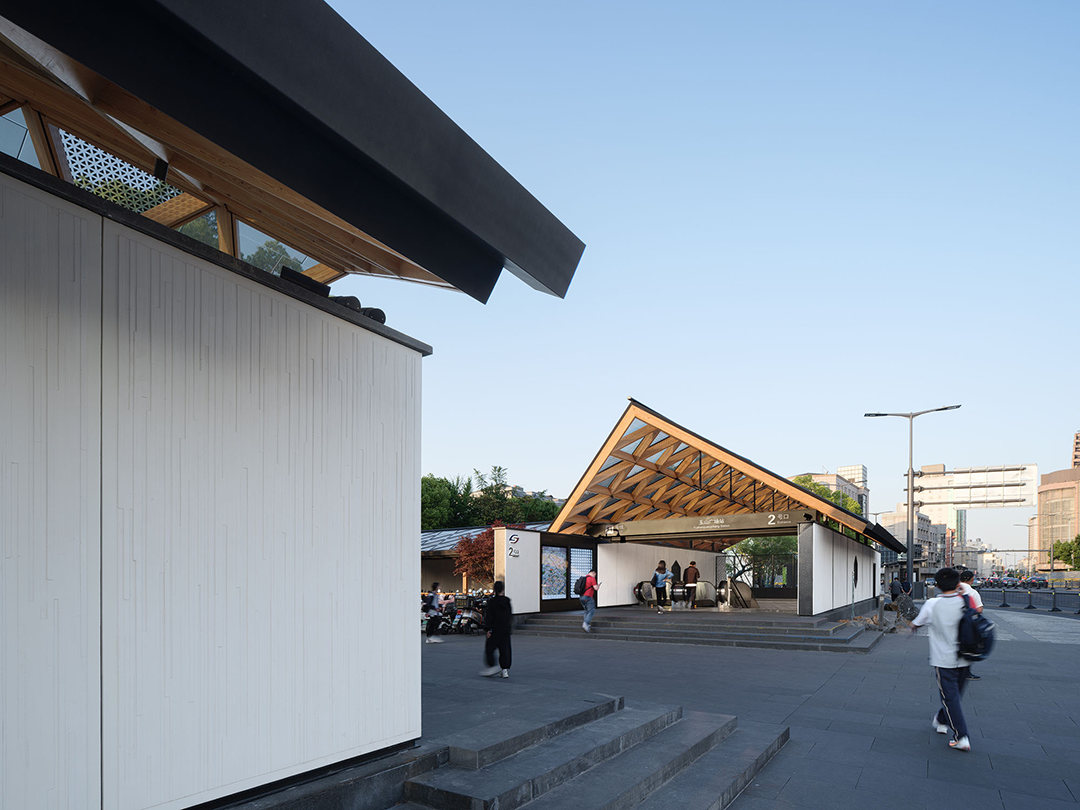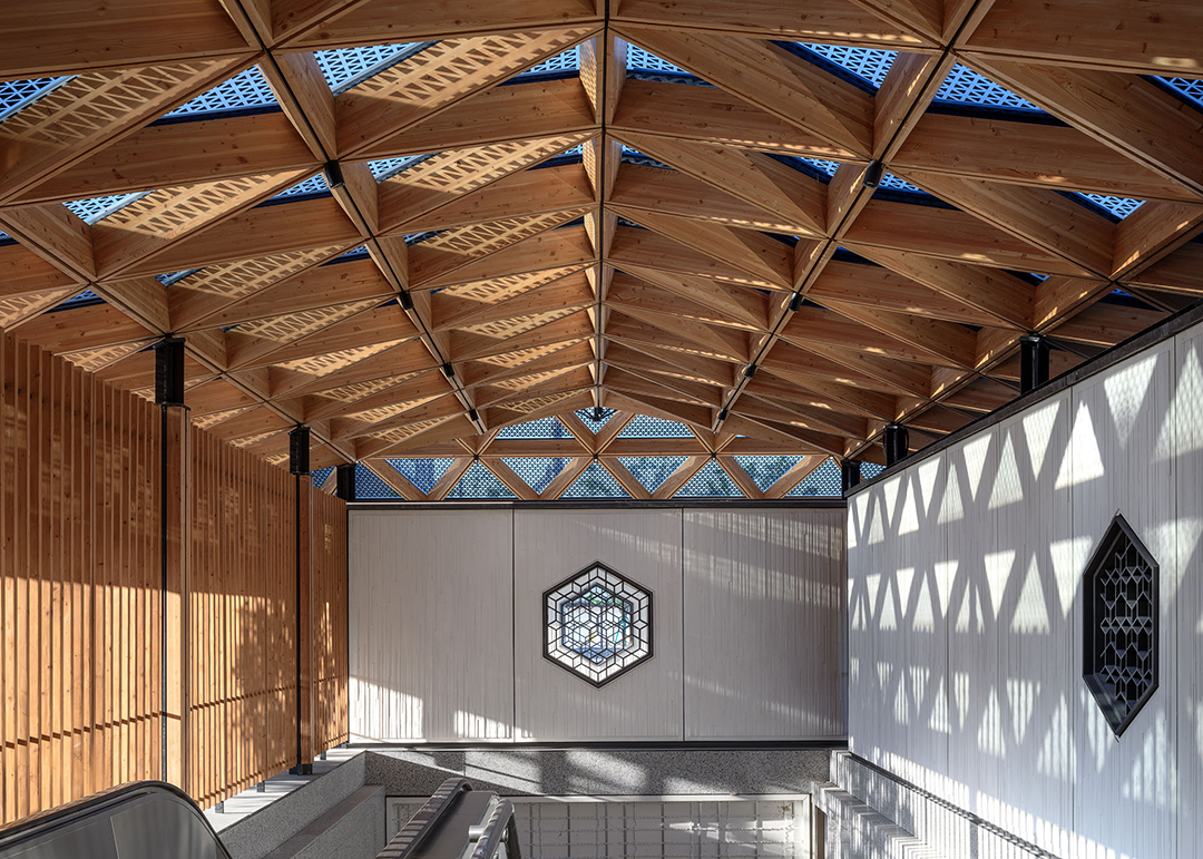 地铁站口建筑由此形成。钢木材质的网架结构、深色玻璃屋面、白色UHPC外墙以及花窗组合,都是对“粉墙黛瓦”的江南建筑和园林语言的现代式转译。