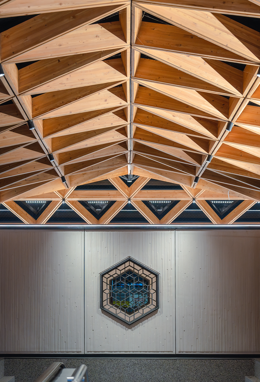 引入钢木混合结构:“T”字形的钢梁藏于木质腹板梁间,形成网架整体受力,使结构构件小型化,视觉上兼具木构的温和与现代建筑的轻盈;大跨度的屋架处以拉杆加强结构的稳定性。灯光和布线整合设计于装配式的屋架菱格单元之中。