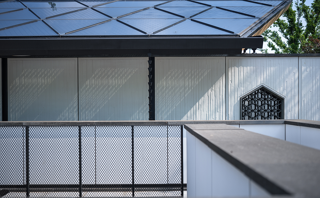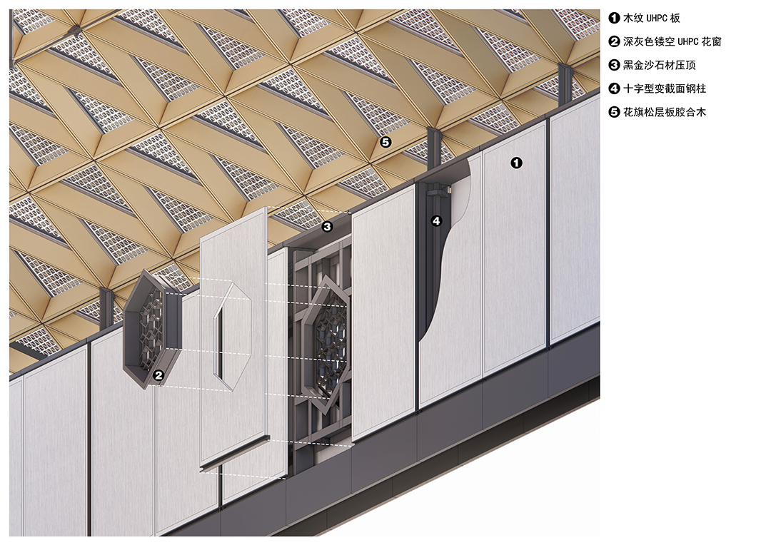 白色UHPC墙板构造:十字断面的两列钢柱支撑起整个屋面,并隐藏于双面UHPC干挂外墙板中,墙体与屋面间脱缝,引入自然风,同时增强屋面的悬浮感。挂板表面为纵向木纹肌理,墙板间有节奏地露出钢柱翼缘,结合压顶和墙裙的石材共同形成白色墙体上的深色格构,饰以花窗点缀,让人联想到江南园林中的景墙。