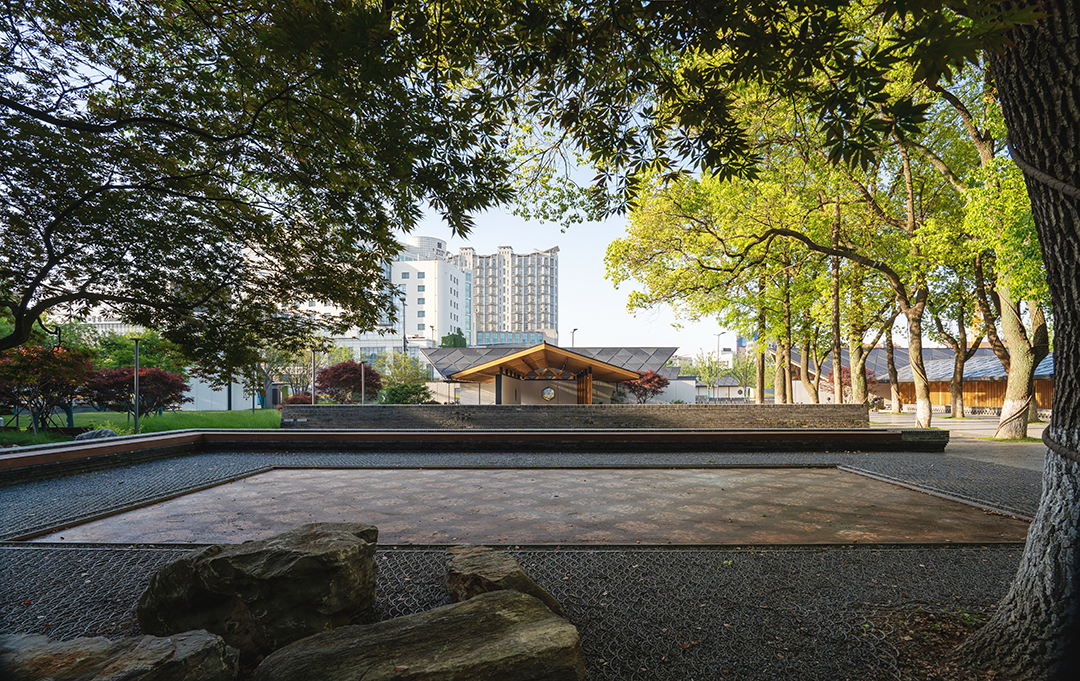 对照清道光年间的昆山县署图,可见玉山广场就处于旧时衙署的位置。现状玉山广场中早已不见历史遗存,却有参天的香樟和水杉林。广场为高出周边道路的一片台地,大树的树底也高于街道地面和地铁出入口的设计标高。为不破坏树根,设计在让出树根的区域将广场地面局部下沉,以平接地铁出入口和周边道路。去往站口的人行通道从各个方向汇入广场,隐没于场地的花径和矮墙中,行走其中颇有曲径通幽的意趣。