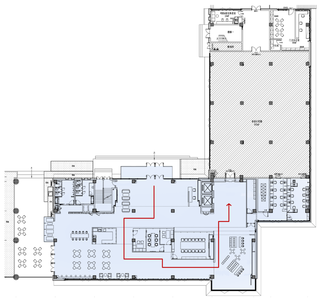首层平面布局中,沿建筑外幕墙逆时针行进,依次串联起接待大堂、等候区、休闲咖啡区、开放式企业展厅与电梯厅(竖向交通枢纽)。环形动线中央设对外接待会议区,外环空间贯通通透,以简洁明亮的基调营造 “移步易景” 的体验 —— 沿途以多元视觉亮点串联,为不同参访者赋予差异化的空间感知与感官共鸣。