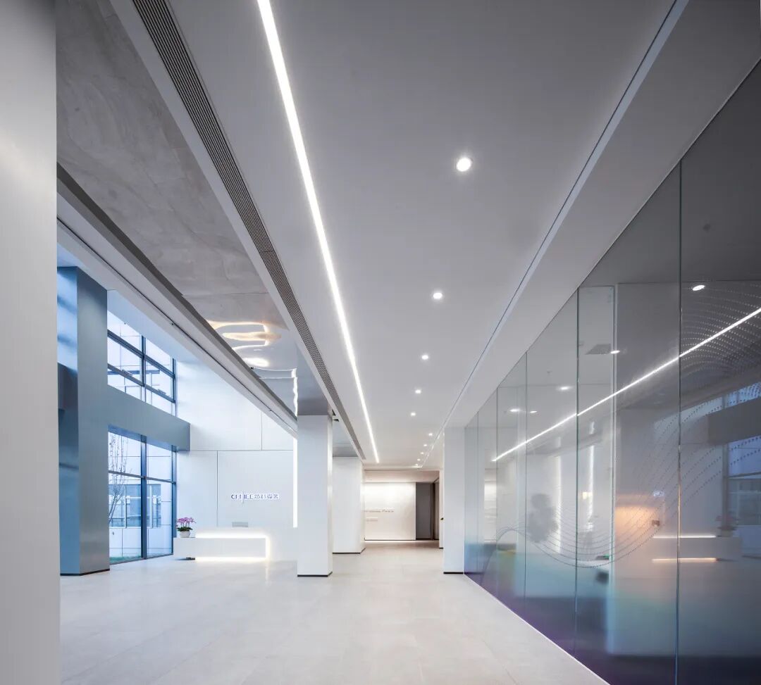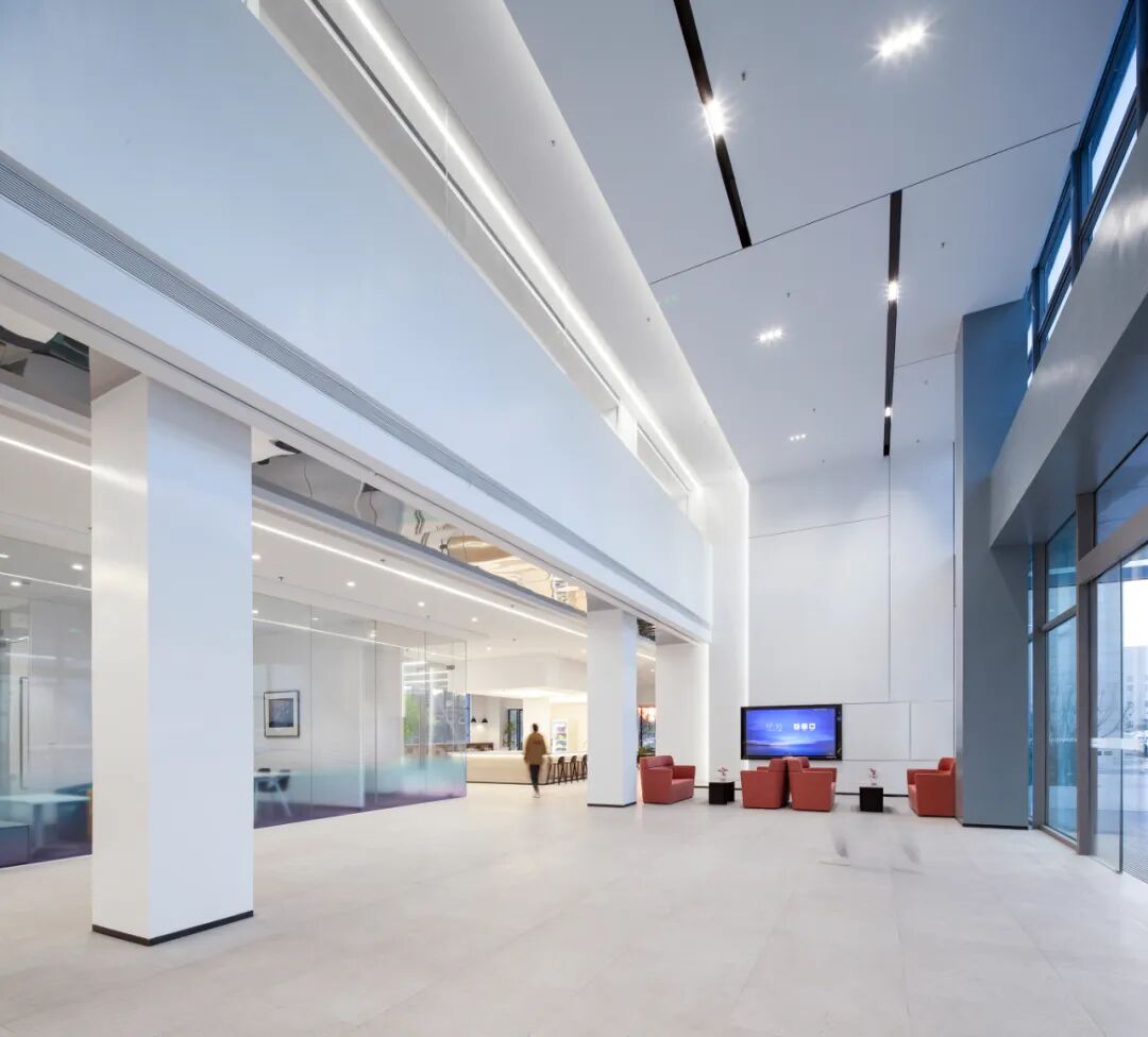 二层办公空间与首层大堂的分隔墙体,其上半段采用通透玻璃隔墙设计。这一处理既从立面维度丰富了大堂的空间层次,又使二层内侧办公区得以间接引入大堂的自然光线,让整体空间的光环境更显舒适宜人。