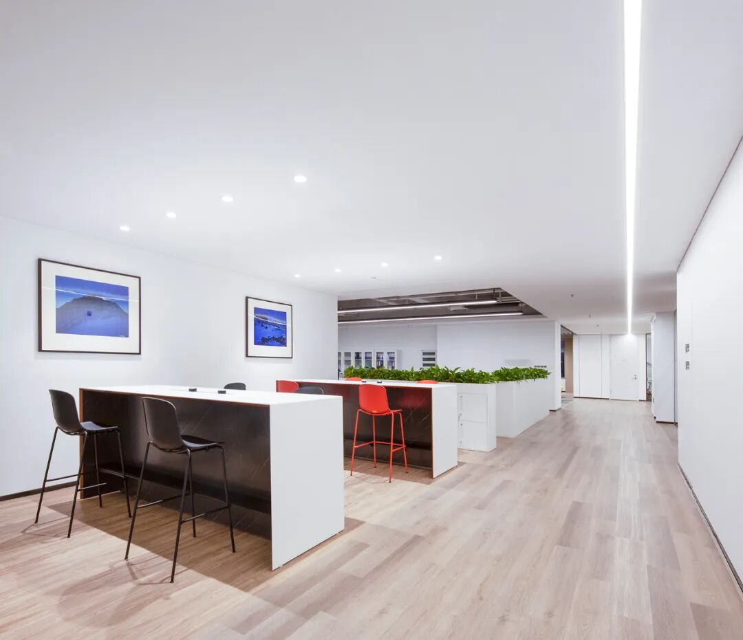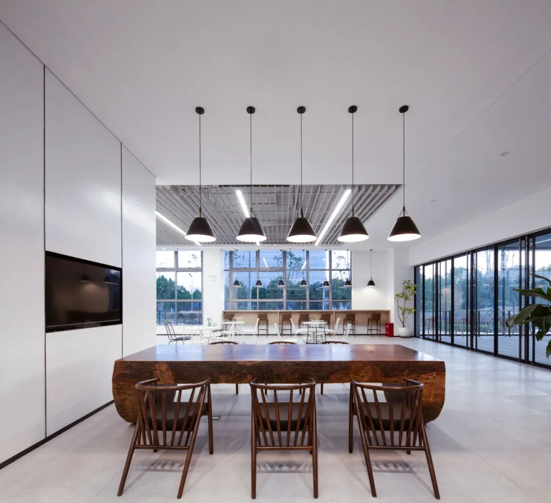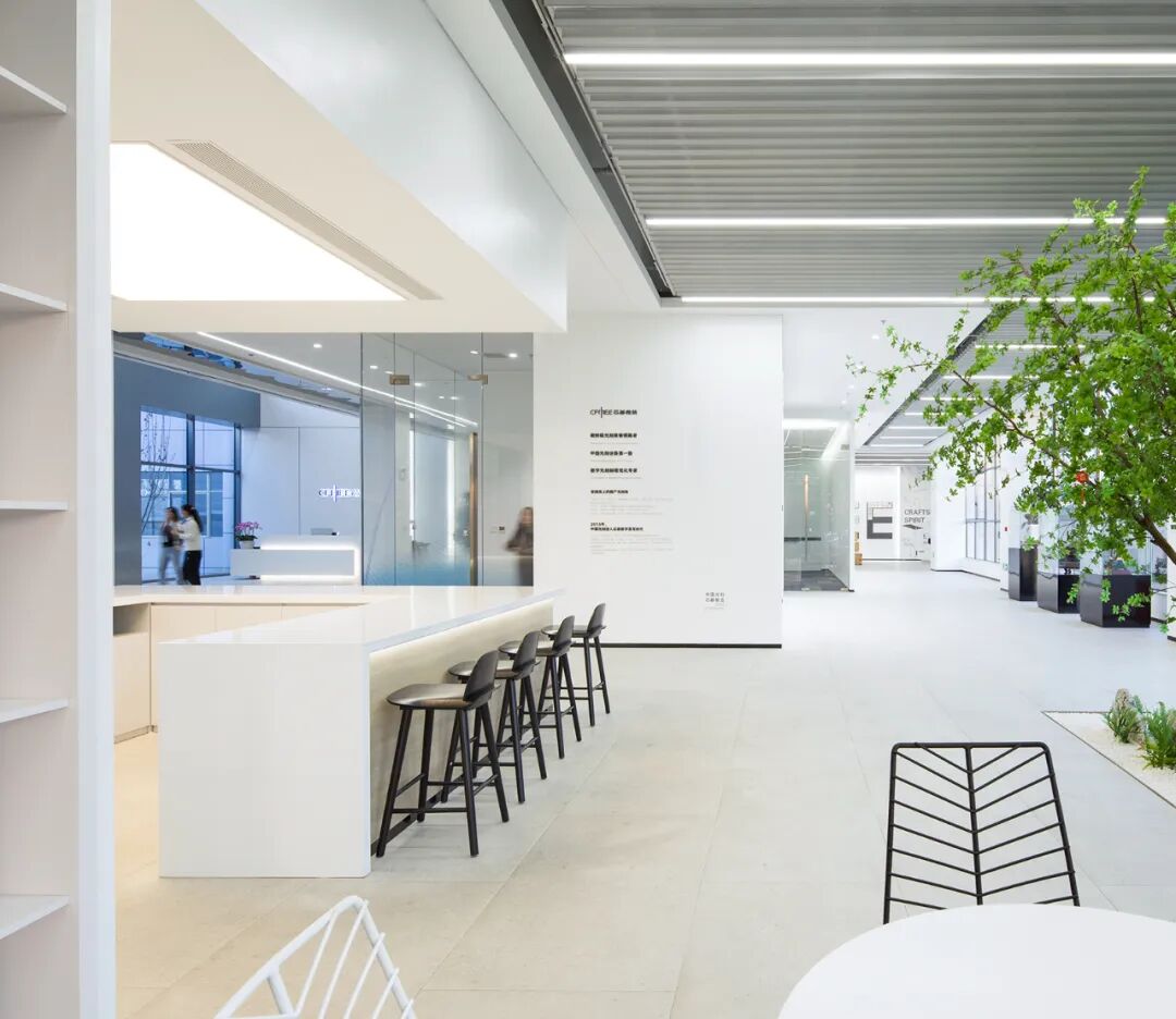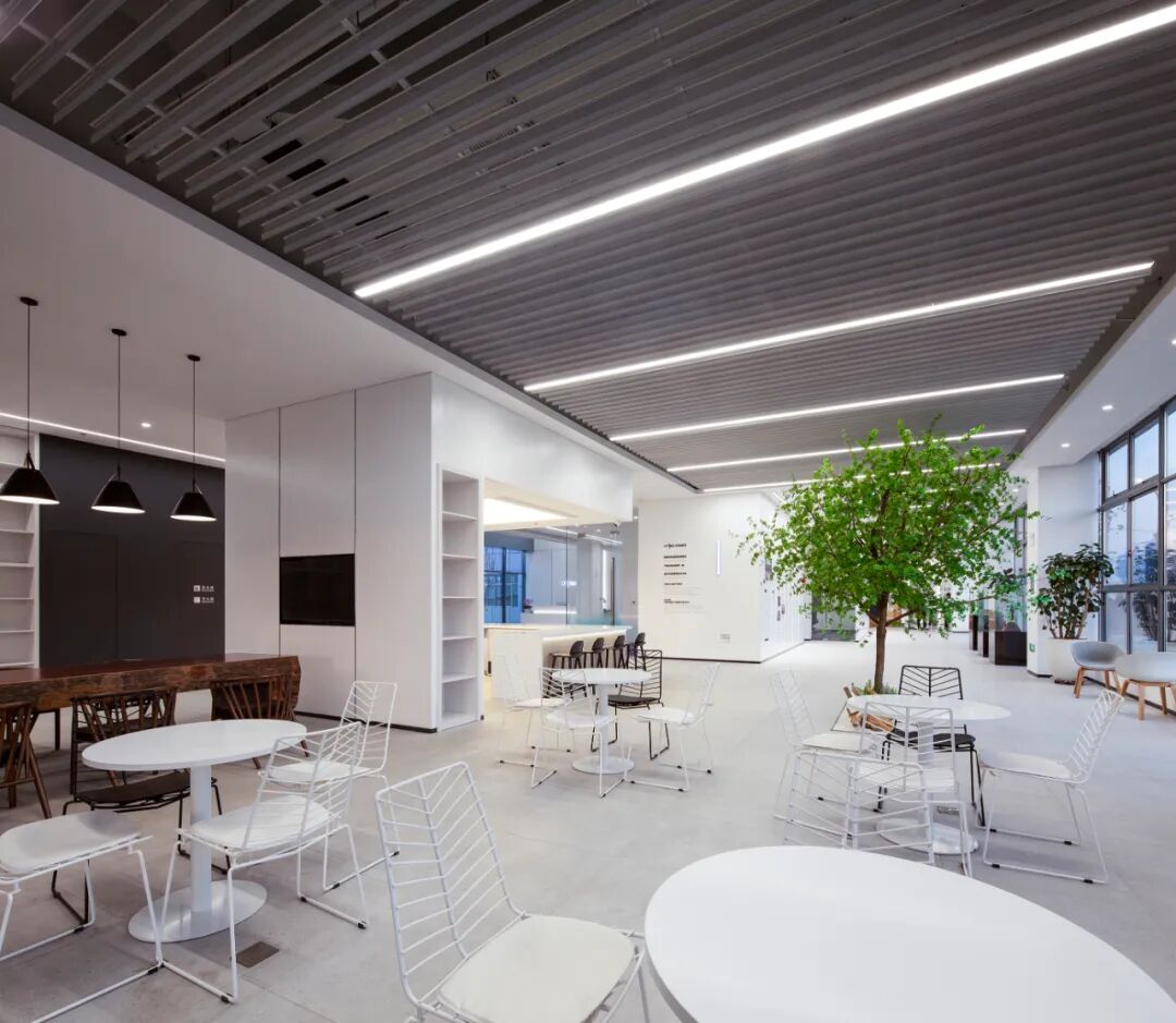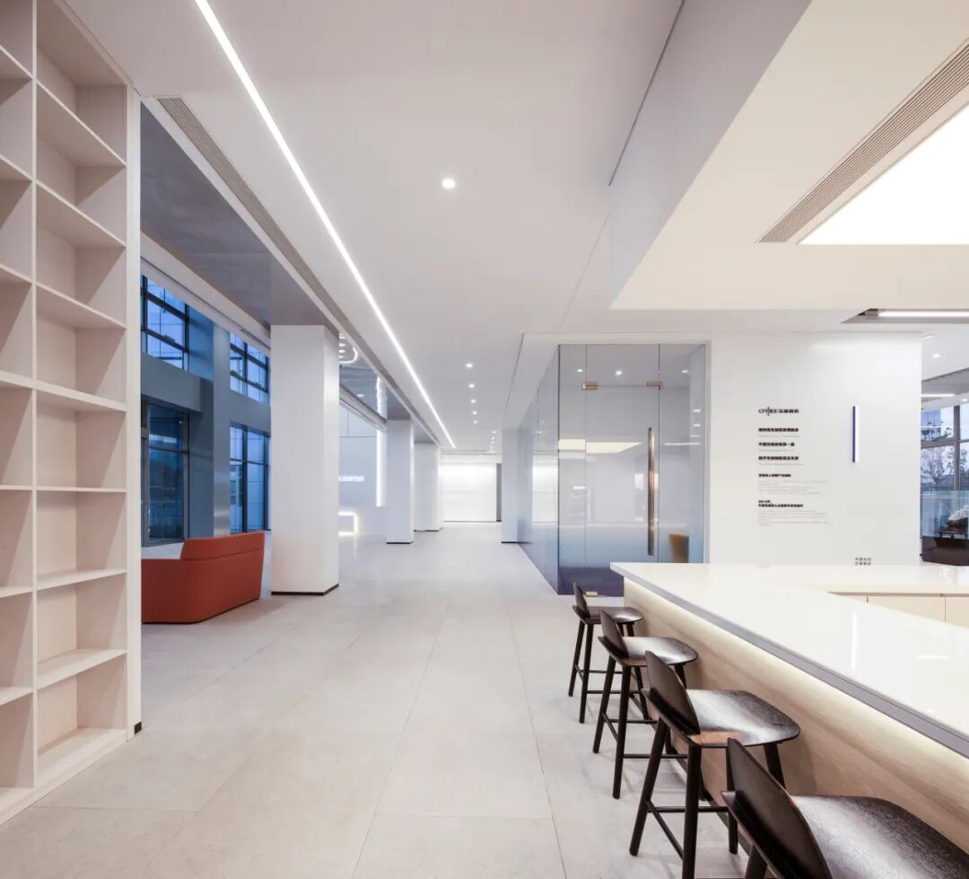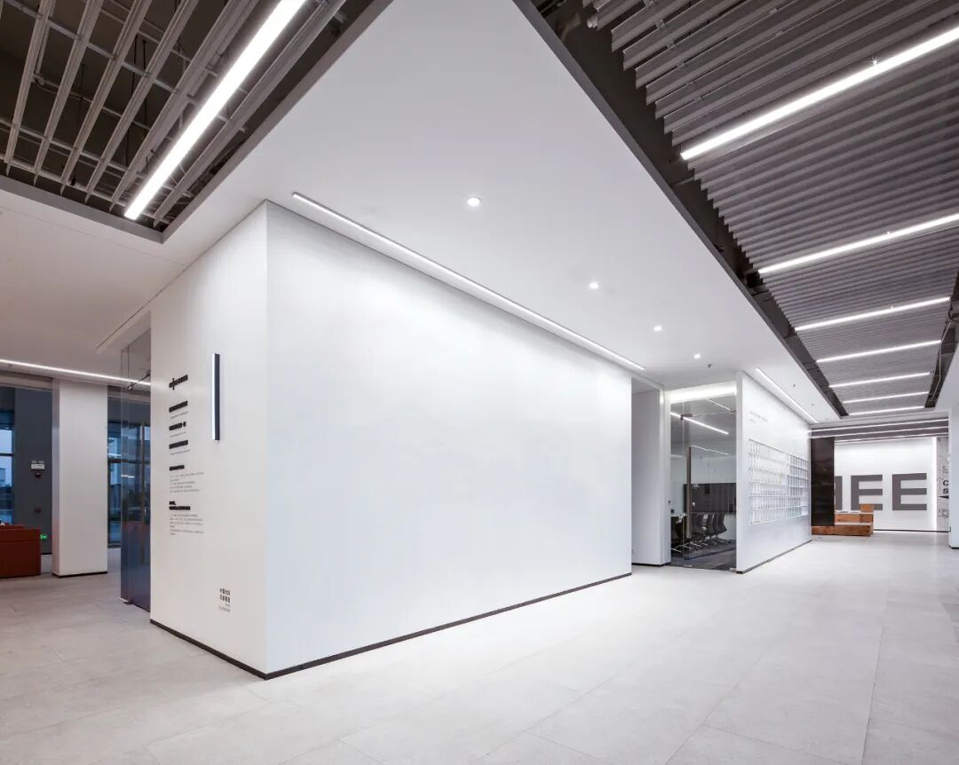 标准办公楼层中,设置了多处可切换使用场景的共享空间,兼具灵动办公与休闲分享功能。空间处理以硬朗洗练为基调,营造出富有速率感与光感的空间氛围,与芯碁的事业特质形成完美呼应。