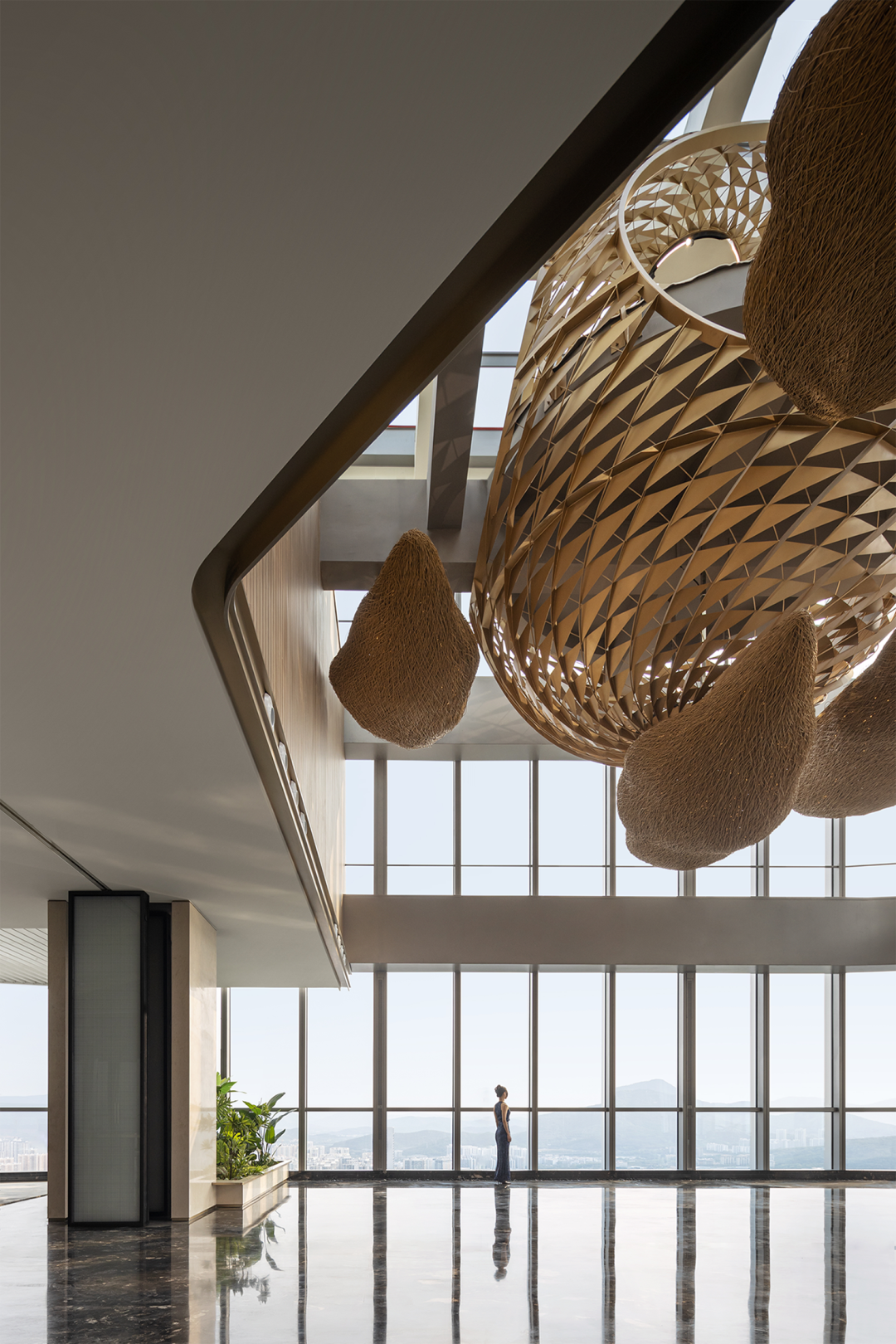 集艾设计深入探索这片土地的地域性,将文化传承和自然元素融汇,进行人文深度的挖掘与艺术氛围的铺陈,勾勒城市精神的双重叙事——那是三亚独有的归属情感与认同共鸣。纳尽南海风华,将云端的隽雅尽数表达,铺陈流动的、纯粹的蔚蓝诗篇。凌空200米,漫步于41层云顶展厅,自全景阔幕般的落地窗向下俯瞰,城市山海,一览无余。整层建面约2410平方米,置身于此,海天共此一色,便是与无垠做了邻居。 甫一入内,展厅的大型吊挂雕塑便瞬时成为视线的焦点——那是名为「云月织光」的海南竹编艺术装置。黎族是海南岛上最早的居民之一,在岛上居住已有五、六千年,其藤竹编织技艺的历史同样悠久,传承至今已成罕见的非物质文化。竹间轻风,海上明月,旧技新生,工艺无朽。斑驳的光线穿透细细密密竹丝,姿态夸张而又流畅,毫无拘束之感,给原本静态空间增加了飘逸自由的流动感。