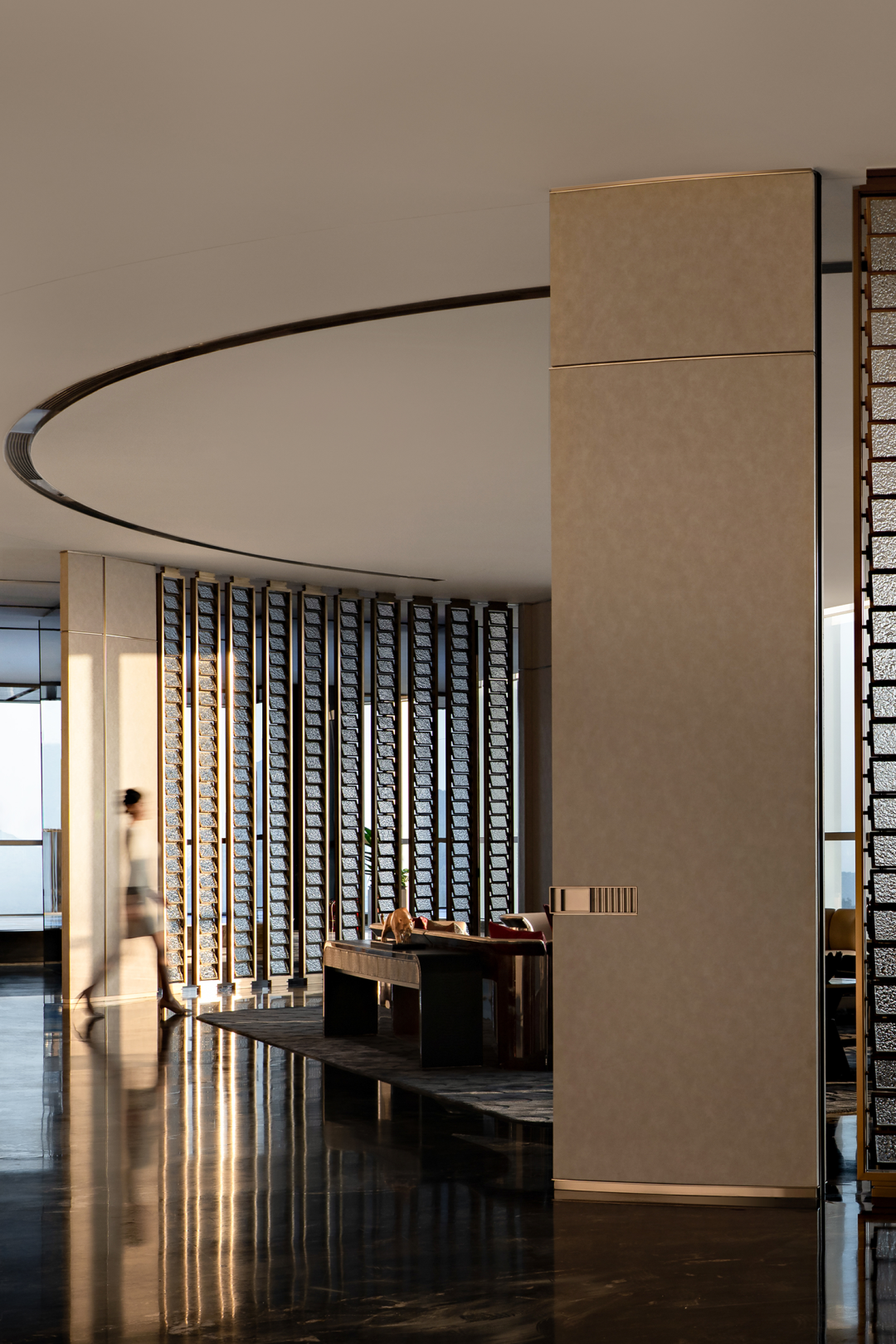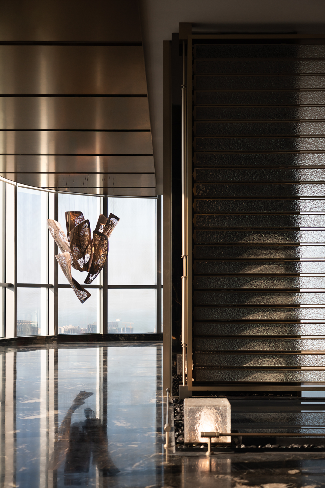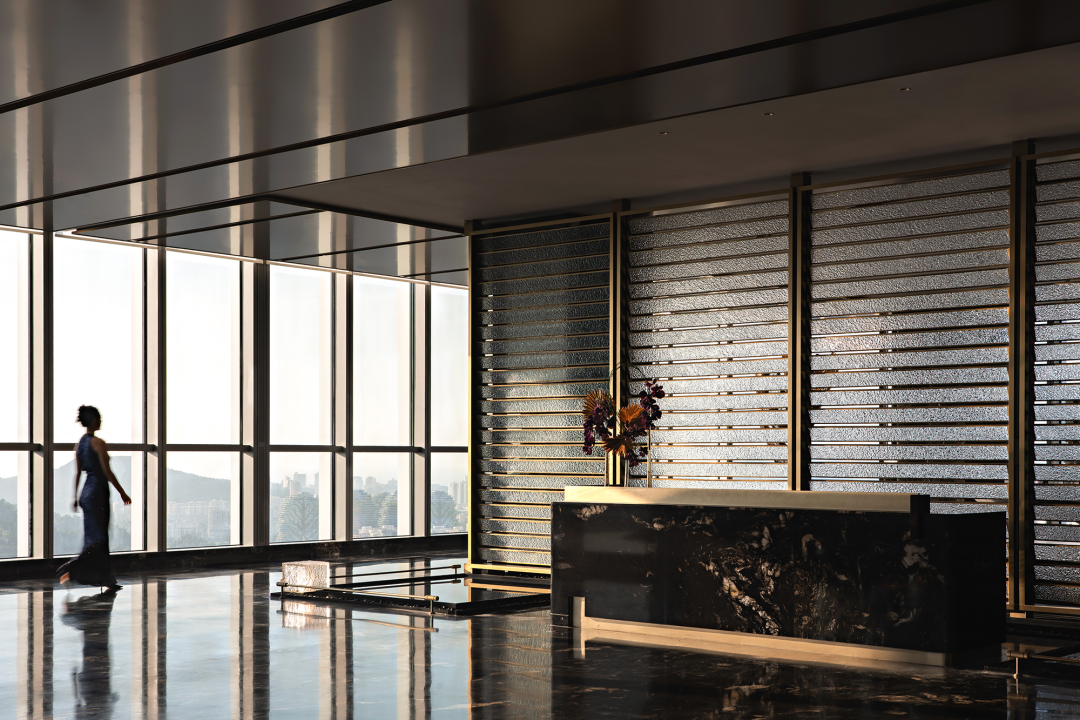 接待台于古奇黑奢石中融入螺钿与金箔工艺,似夕照浮金,于深邃中绽放内敛的华光。一角的水晶灯具装置由水晶厚切出灯体,嵌入金属构件增加对比。每一寸肌理,每一道光痕,皆在无声雕琢观者对三亚的初印象——奢华与自然在此共生,匠心与光影在此共鸣。