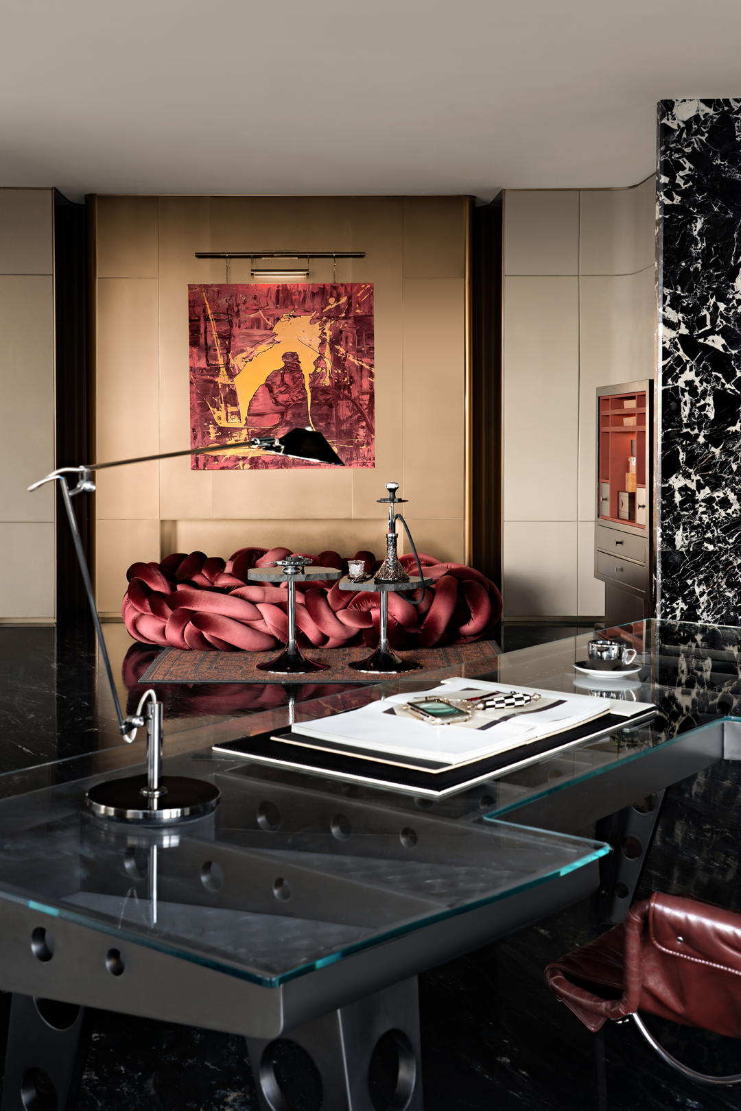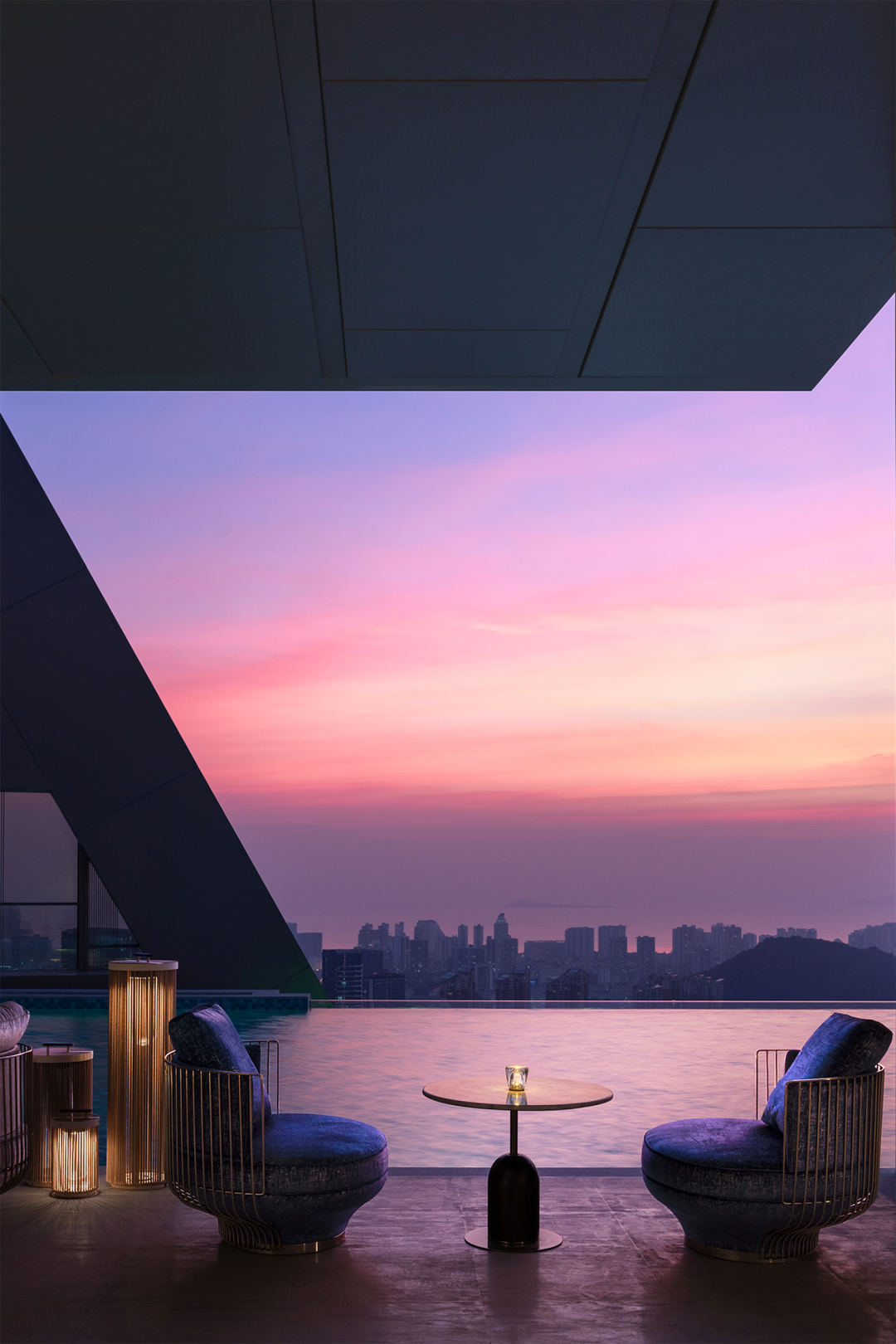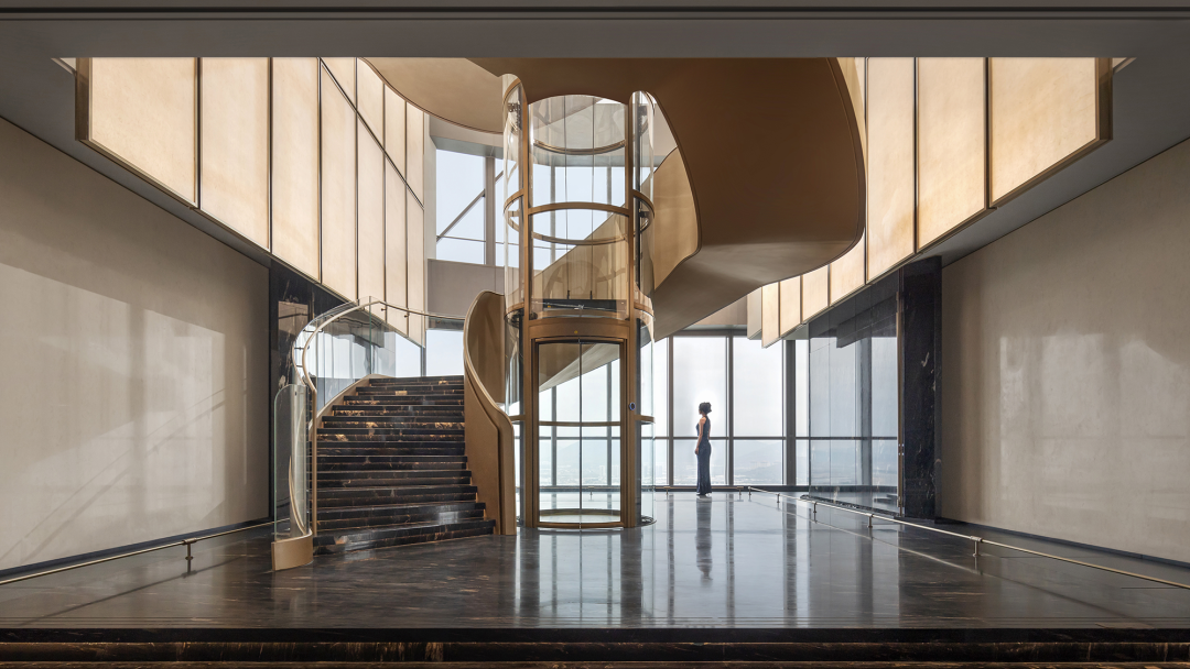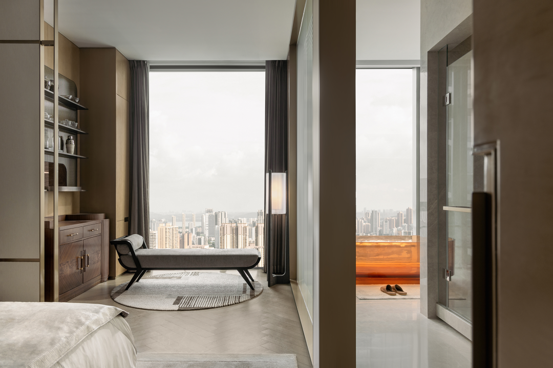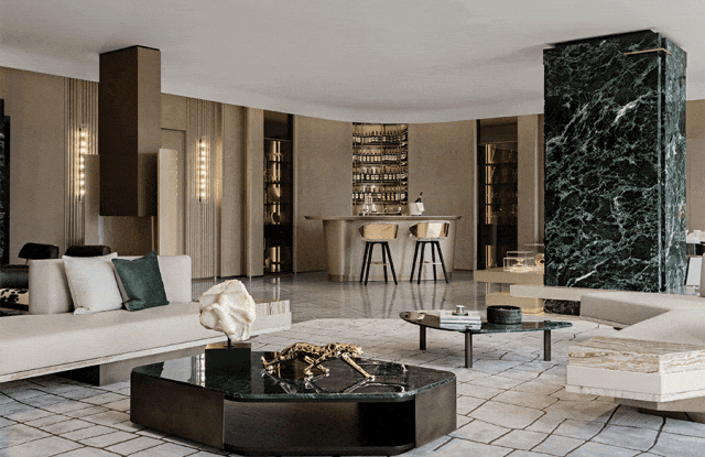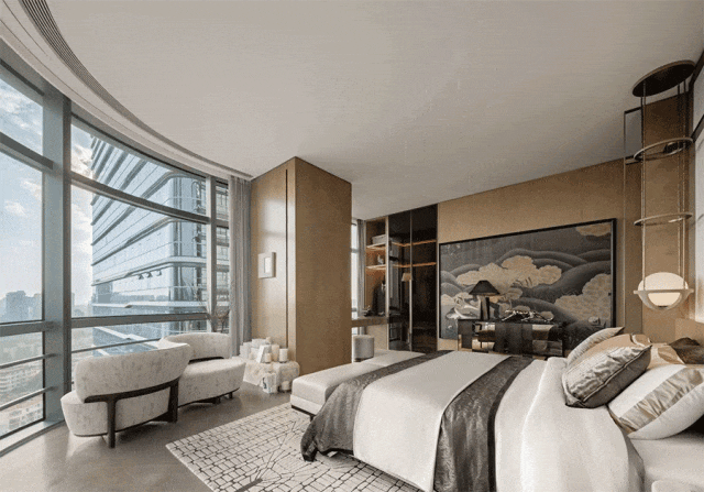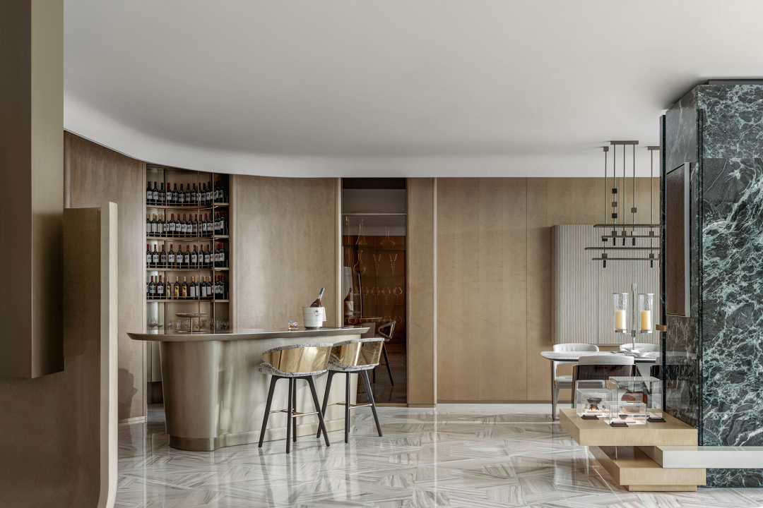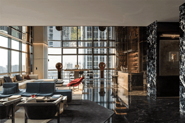 挑空层高12米的异形旋转楼梯,金属的光泽在光线的映照下熠熠生辉。它超越了单纯的交通功能,以摩登的曲折萦回引导空间动线,以独特的视觉魅力、空间效率、结构巧思和可塑性,化身为一件艺术品。阳光透过透明电梯,阴影交汇充满诗意。建筑宛如乐器,器物不是最终的目的,而是需要被弹奏,被使用,从而创造美的瞬间。人们在升降过程中将城市尽收眼底,望向天空、眺望大海。时间、季节,光影的变化流动不息,为旅者打开了空间旅程的序列,使之得以悠然前往下一个区域。无边际泳池位于43层,是海南最高的360°无边泳池。暮落星辉浸染粼粼波光,晕紫,深赤,旷碧,天空与水波共同颜色浮溢,周围是飘逸的檐篷与葱郁的绿植,仿佛隐逸于一座悬浮空中的梦幻岛屿。细节与质感的雕琢,为空间营造了感官冲击与张力。身处这凌空悬的云境,逐浪而行,仿佛游弋于天际。抬首,是南海无垠的壮阔在眼前磅礴铺展;俯瞰,城市脉络在脚下化作流动的光河。每一眼回望,皆是私藏天际的独享快意。桌上氛围灯晕开私语般的光晕,角落风灯摇曳着碎金般的星火,吧台灯架如倾泻流淌的光瀑——每一束光,都是精心雕琢的艺术笔触。指尖轻晃的特调鸡尾酒,与眼前流转的星海交相辉映,共赴一场沉入感官深处的微醺之旅。卫生间采用光影、全息、互动装置等前沿多媒体艺术与智能调光玻璃、幻彩膜、轻透织物等创新环保材料,将平淡无奇的日常空间打造为一场流动的奇幻盛宴,如入未来之境。空间随昼夜、人流变幻,营造明暗对比光影游戏。这是一个融合社交、工作、度假、会所等多种功能的空间,设计师以 Art Deco 为基质语言,将摩登时代的理性骨骼,与东方美学的含蓄气韵精妙熔铸。鲜艳色彩、大胆几何、异域材质交织、激荡,奏响一曲黄金年代般奢华的即兴爵士,使空间本身化作一场流动的设计沙龙。空间中处处充满摩登与怀旧的垂直对话——斑驳石纹的立柱与光滑的金属饰面的对比,红色与黑色块面的交接,蓝色丝绒沙发与透明办公桌的碰撞,令空间充满了细腻而迷人的层次感,不啻为入住者开启了一场日常中的艺术之旅。镜面、烤漆、奢石、皮革、丝绒等材质的搭配大胆而矜贵,锚定一个空间、一位房主、一座城的人文肌理与非凡美学。这是从世间万物中吸取趣味要素的空间,是用艺术品位匠心构筑的「奢侈品级」空间,献给少数追寻品味者,像收藏奢侈品一样去收藏。这是摩登时代的城市之声,是灯红酒绿、衣香鬓影的奢华,既有复古矜贵的仪式感,又添了当代的不拘一格。这个空间则更强化住宅的舒适与温馨感受,亦兼得会所的灵活性,无论是注重家庭生活的精英人士还是壮心不已的企业家,都能从中找到合适的使用场景。影木墙面铺就轻柔韵致,其上悬挂斜逸杨帆的黑白摄影作品,如天然泼就的水墨。壁灯与白金沙石材拼花地面交织光影的仪式,明暗转折,光线流泻,时间在此放慢脚步,生活正变得丰盛。而这份游刃有余更过渡至餐厨空间,餐厅界面打通,以超尺度的岛台在空间中重构建秩序,背景墙与定制柜结合,让功能与美学相得益彰。定制酒柜化身悬浮的艺术,香槟色灯具投射琥珀光晕。如海浪般流畅,如港湾般庇护,这是与世界短暂隔开的角落,以供身心相依。双主卧套房设计,非对于多代家庭旅居度假重要性无需多言,同时对于更需要不受干扰的睡眠环境的伴侣而言也是更为适配。