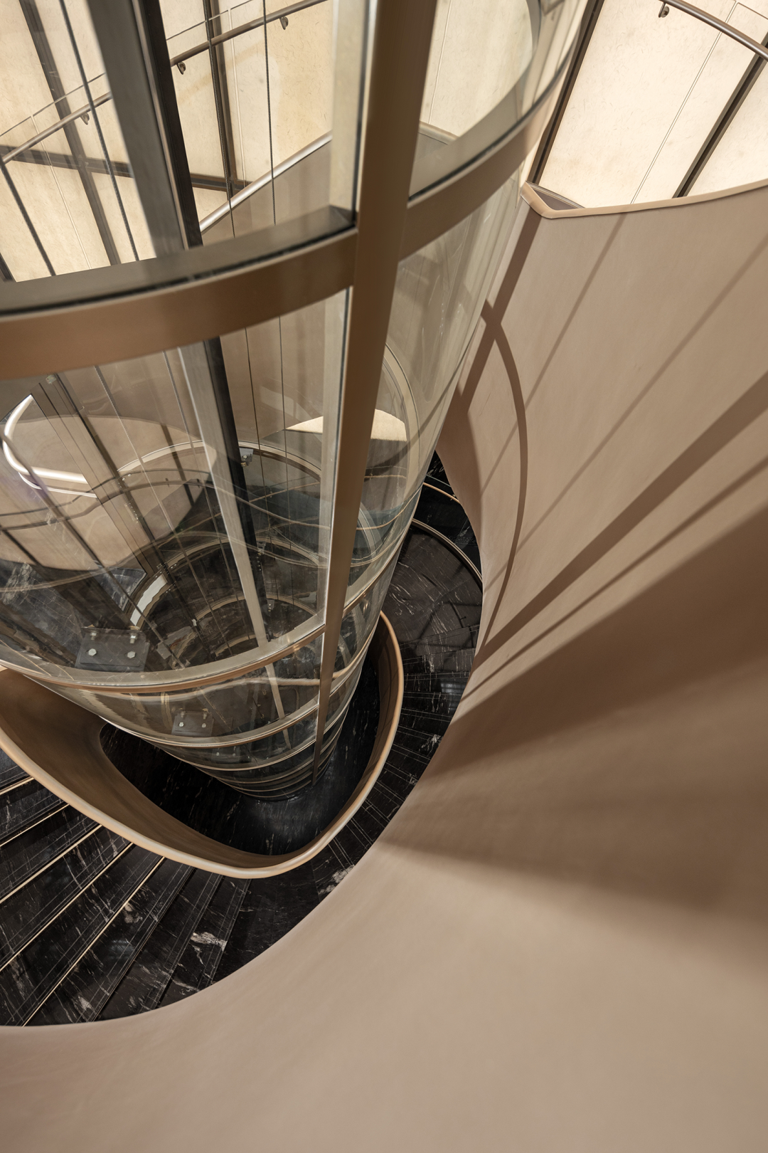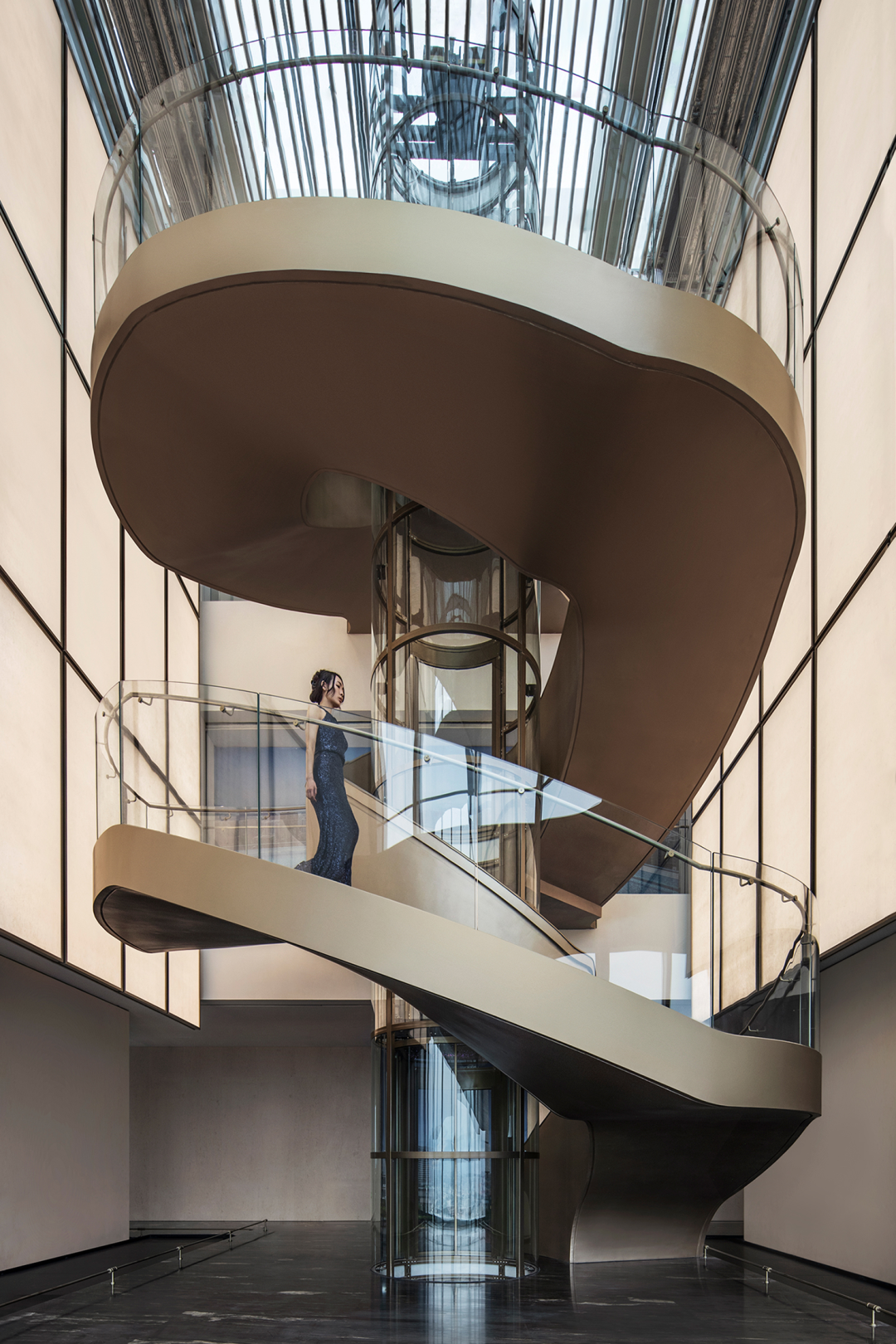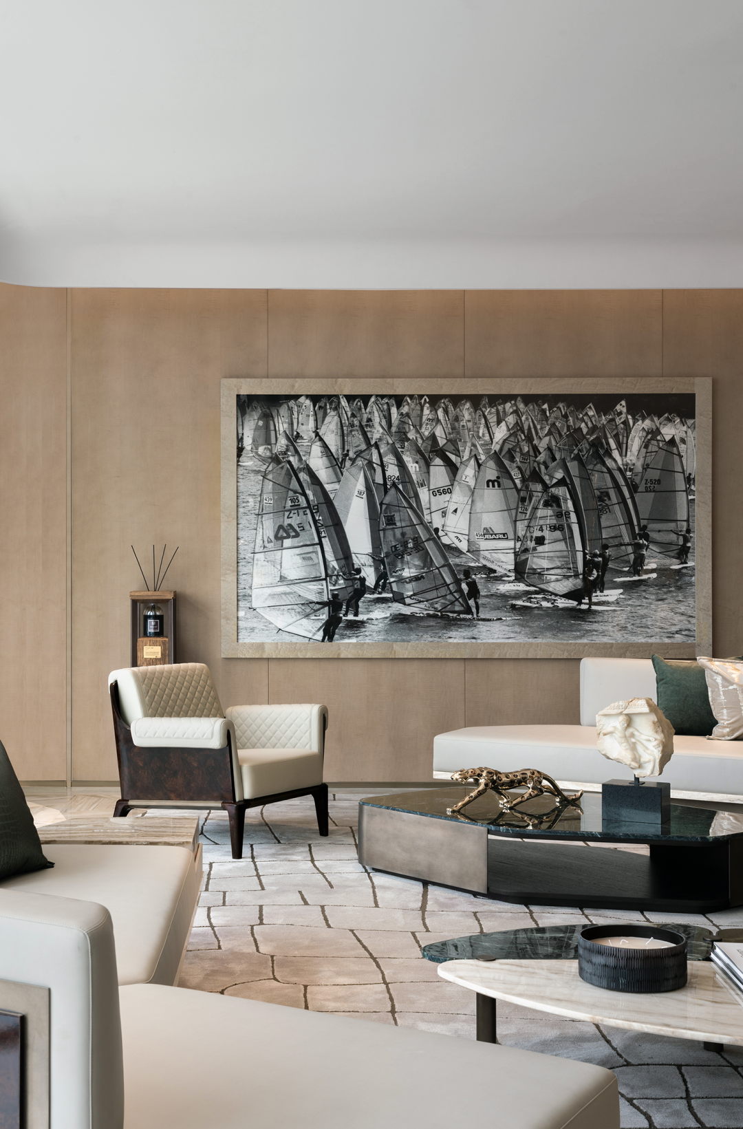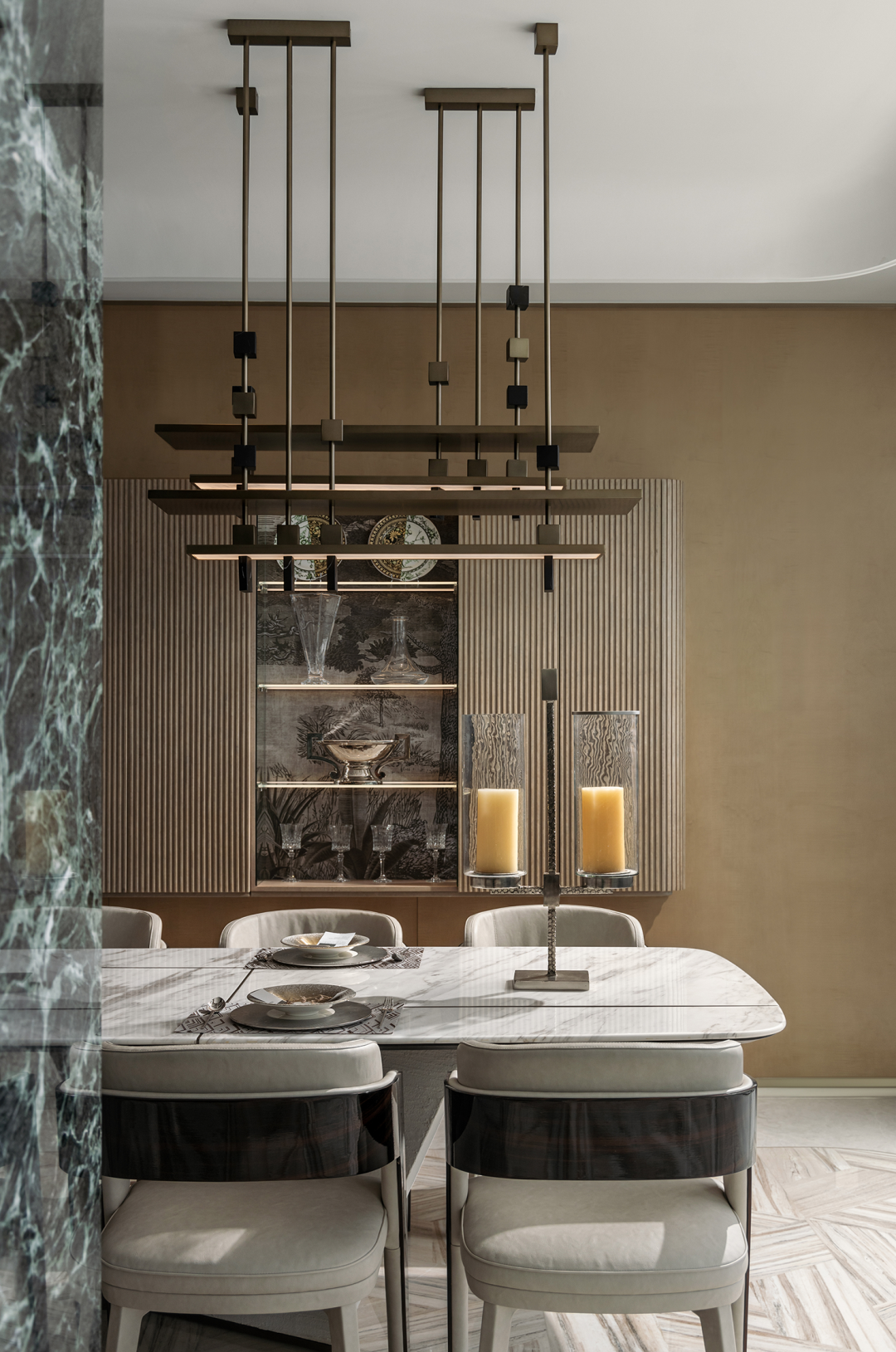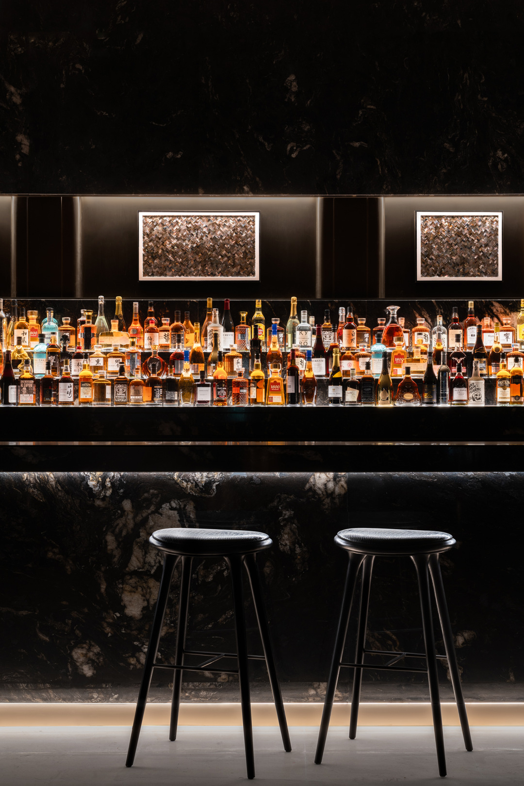 挑空层高12米的异形旋转楼梯,金属的光泽在光线的映照下熠熠生辉。它超越了单纯的交通功能,以摩登的曲折萦回引导空间动线,以独特的视觉魅力、空间效率、结构巧思和可塑性,化身为一件艺术品。阳光透过透明电梯,阴影交汇充满诗意。建筑宛如乐器,器物不是最终的目的,而是需要被弹奏,被使用,从而创造美的瞬间。人们在升降过程中将城市尽收眼底,望向天空、眺望大海。时间、季节,光影的变化流动不息,为旅者打开了空间旅程的序列,使之得以悠然前往下一个区域。无边际泳池位于43层,是海南最高的360°无边泳池。暮落星辉浸染粼粼波光,晕紫,深赤,旷碧,天空与水波共同颜色浮溢,周围是飘逸的檐篷与葱郁的绿植,仿佛隐逸于一座悬浮空中的梦幻岛屿。细节与质感的雕琢,为空间营造了感官冲击与张力。身处这凌空悬的云境,逐浪而行,仿佛游弋于天际。抬首,是南海无垠的壮阔在眼前磅礴铺展;俯瞰,城市脉络在脚下化作流动的光河。每一眼回望,皆是私藏天际的独享快意。桌上氛围灯晕开私语般的光晕,角落风灯摇曳着碎金般的星火,吧台灯架如倾泻流淌的光瀑——每一束光,都是精心雕琢的艺术笔触。指尖轻晃的特调鸡尾酒,与眼前流转的星海交相辉映,共赴一场沉入感官深处的微醺之旅。卫生间采用光影、全息、互动装置等前沿多媒体艺术与智能调光玻璃、幻彩膜、轻透织物等创新环保材料,将平淡无奇的日常空间打造为一场流动的奇幻盛宴,如入未来之境。空间随昼夜、人流变幻,营造明暗对比光影游戏。这是一个融合社交、工作、度假、会所等多种功能的空间,设计师以 Art Deco 为基质语言,将摩登时代的理性骨骼,与东方美学的含蓄气韵精妙熔铸。鲜艳色彩、大胆几何、异域材质交织、激荡,奏响一曲黄金年代般奢华的即兴爵士,使空间本身化作一场流动的设计沙龙。空间中处处充满摩登与怀旧的垂直对话——斑驳石纹的立柱与光滑的金属饰面的对比,红色与黑色块面的交接,蓝色丝绒沙发与透明办公桌的碰撞,令空间充满了细腻而迷人的层次感,不啻为入住者开启了一场日常中的艺术之旅。镜面、烤漆、奢石、皮革、丝绒等材质的搭配大胆而矜贵,锚定一个空间、一位房主、一座城的人文肌理与非凡美学。这是从世间万物中吸取趣味要素的空间,是用艺术品位匠心构筑的「奢侈品级」空间,献给少数追寻品味者,像收藏奢侈品一样去收藏。这是摩登时代的城市之声,是灯红酒绿、衣香鬓影的奢华,既有复古矜贵的仪式感,又添了当代的不拘一格。这个空间则更强化住宅的舒适与温馨感受,亦兼得会所的灵活性,无论是注重家庭生活的精英人士还是壮心不已的企业家,都能从中找到合适的使用场景。影木墙面铺就轻柔韵致,其上悬挂斜逸杨帆的黑白摄影作品,如天然泼就的水墨。壁灯与白金沙石材拼花地面交织光影的仪式,明暗转折,光线流泻,时间在此放慢脚步,生活正变得丰盛。而这份游刃有余更过渡至餐厨空间,餐厅界面打通,以超尺度的岛台在空间中重构建秩序,背景墙与定制柜结合,让功能与美学相得益彰。定制酒柜化身悬浮的艺术,香槟色灯具投射琥珀光晕。如海浪般流畅,如港湾般庇护,这是与世界短暂隔开的角落,以供身心相依。双主卧套房设计,非对于多代家庭旅居度假重要性无需多言,同时对于更需要不受干扰的睡眠环境的伴侣而言也是更为适配。