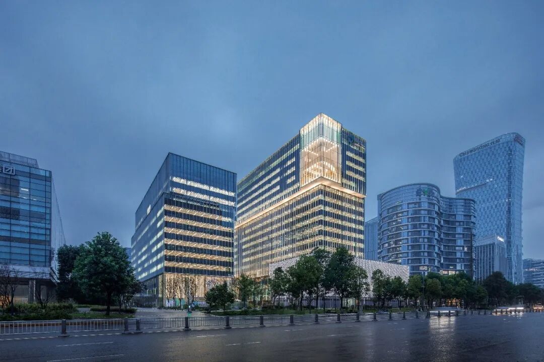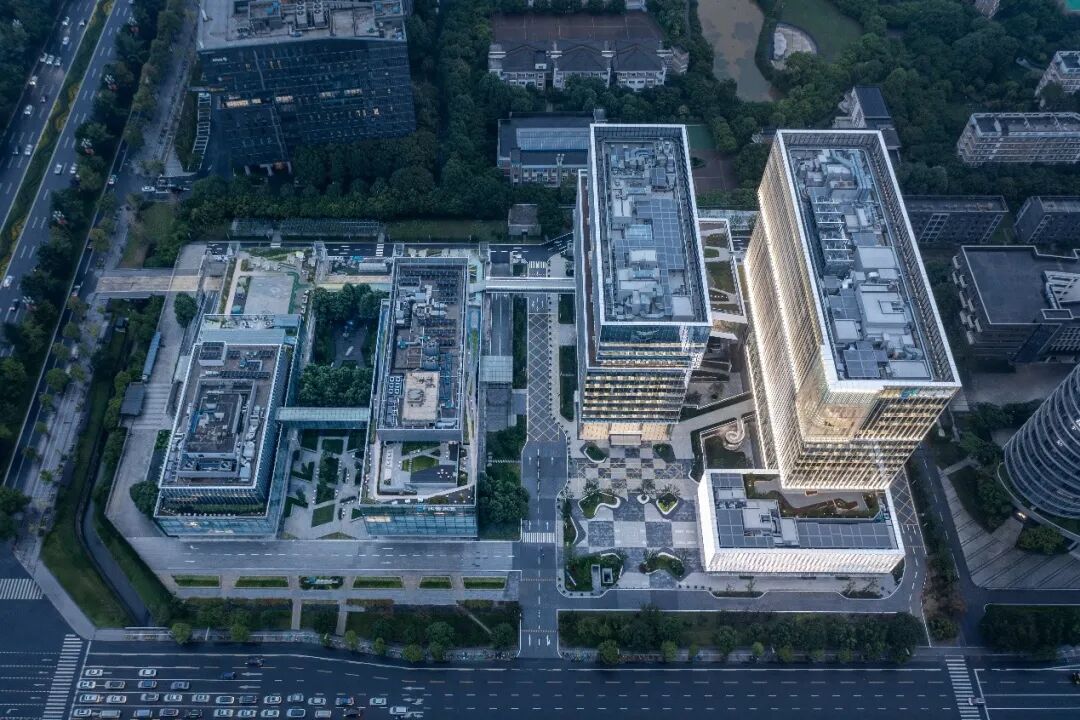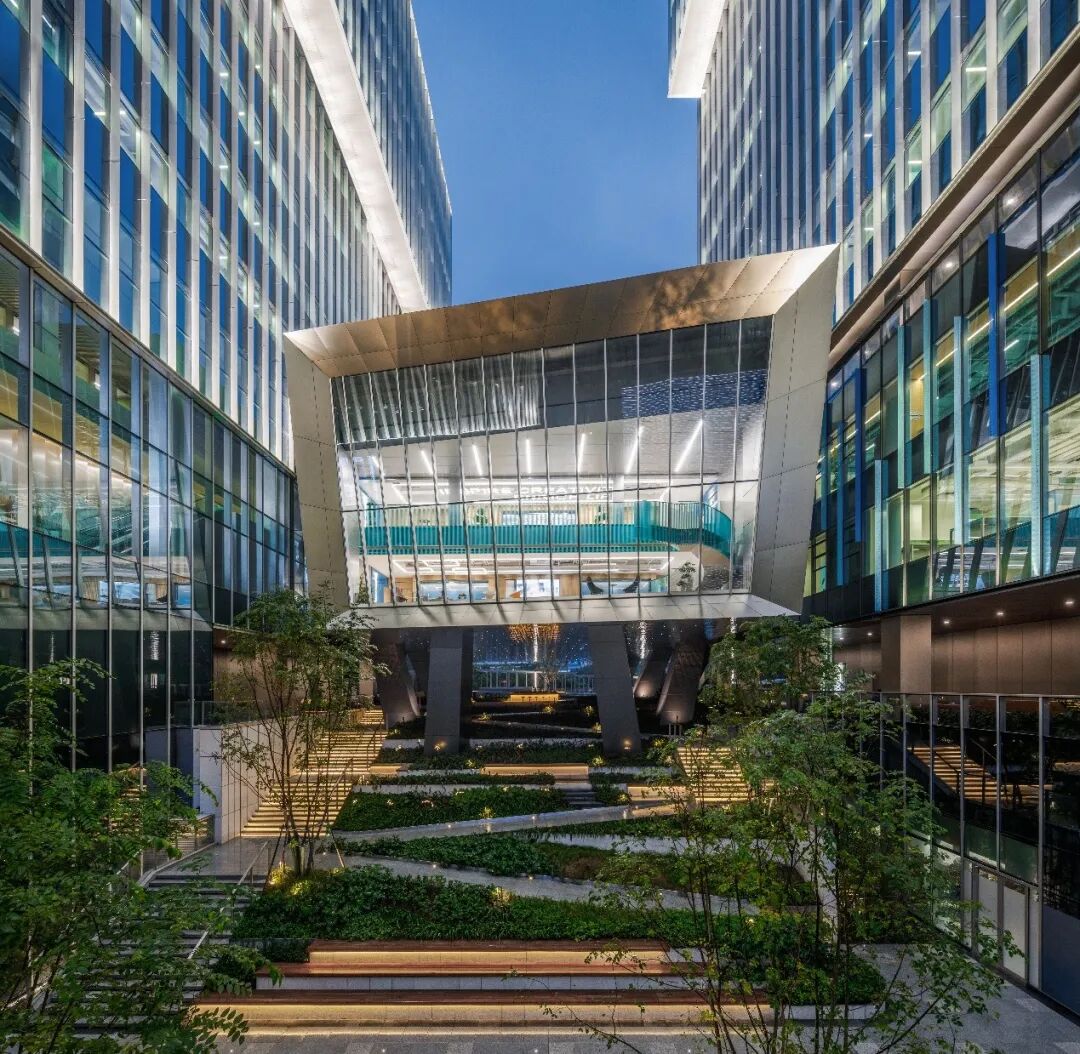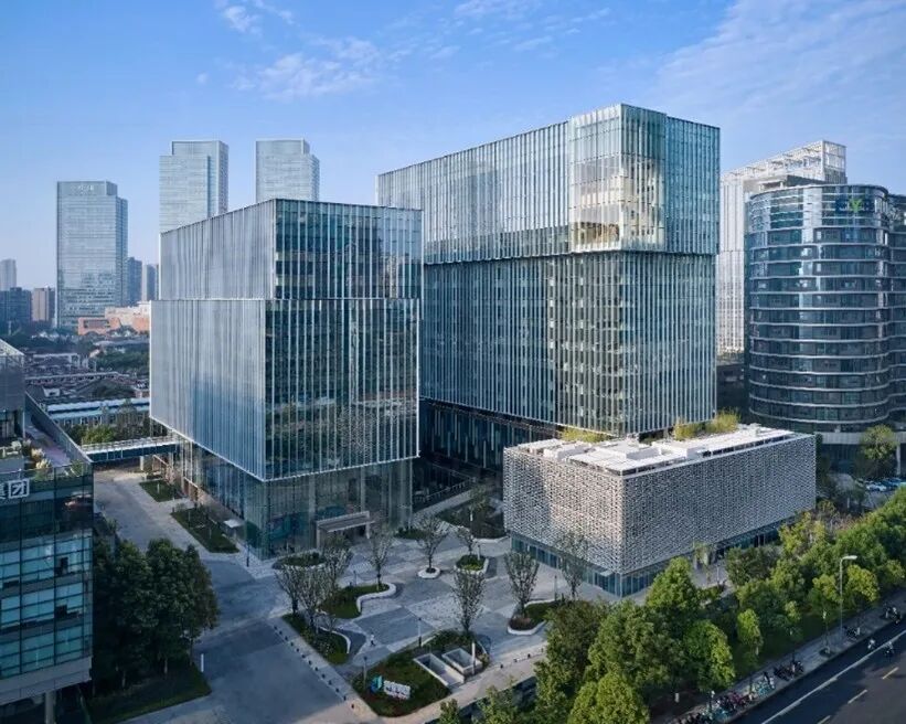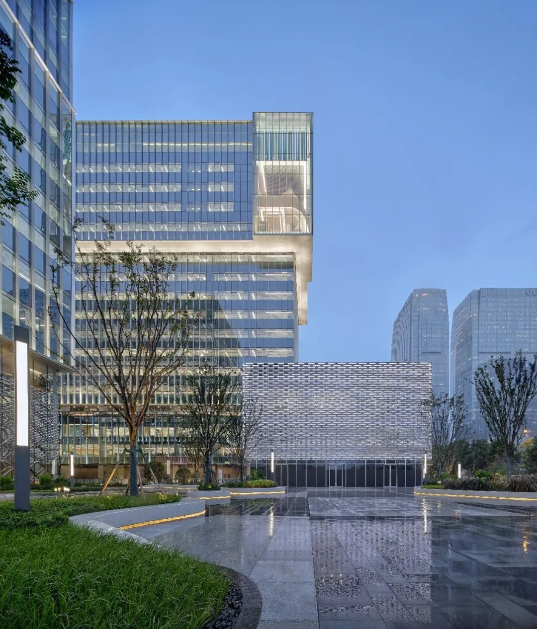 设计将抖音集团的企业文化与成都的地域文化特色相结合,融入了现代、生态、未来等核心元素。园区规划充分面向城市打开,提供更多的市民活动可能性;建筑外观现代简约,旨在打造科技中心标志性园区的展示窗口;建筑设计通过交错的体量布置,形成各种丰富室外空间,结合景观设计,让整个办公空间在立体空间上被景观包围,充分体现公园城市的规划要求。