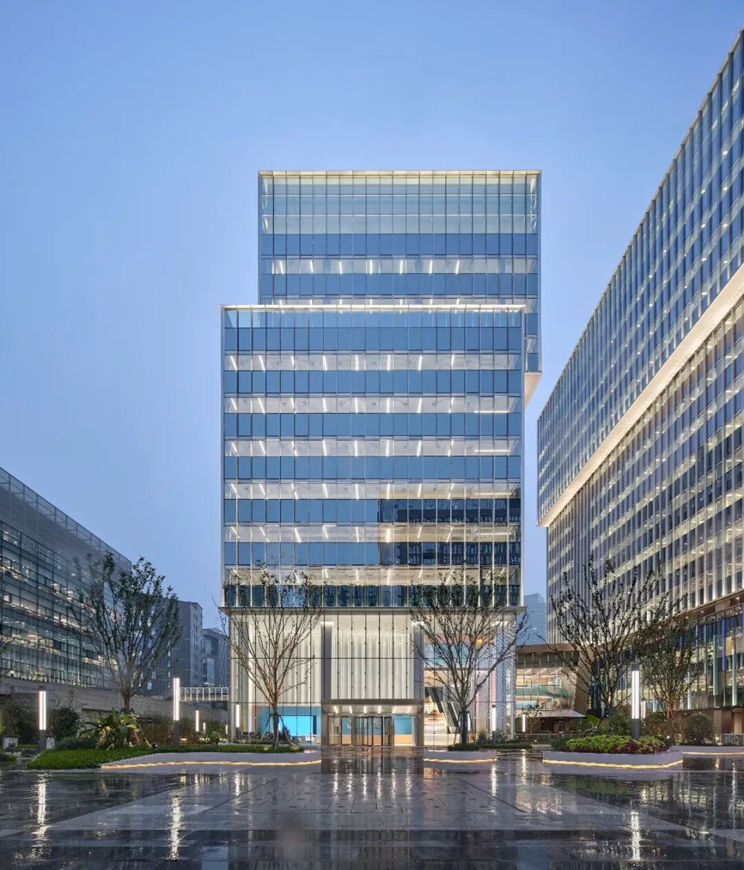 项目建筑外观设计与泛光相结合,打造简约素雅的现代高科技办公楼形象。塔楼最高处设计通透的玻璃盒子作为夜间整个区域的视觉中心点。