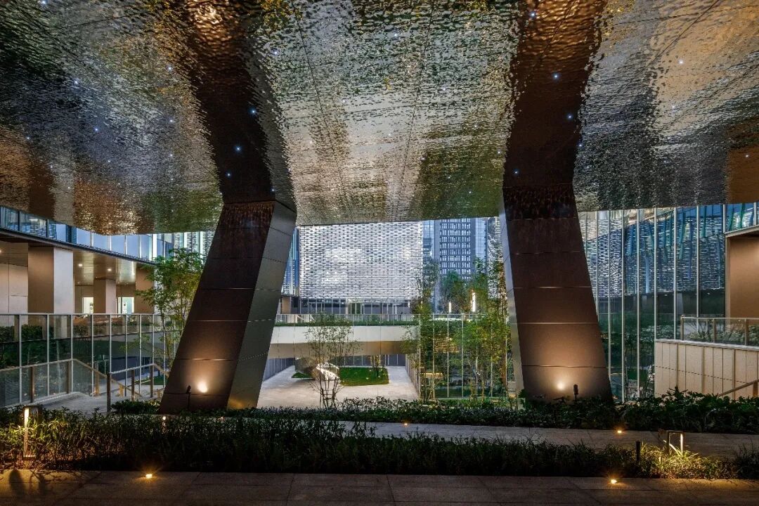 架空空间吊顶采用金属波纹铝板,可以将景观映射至整个顶部界面,让空间更加开阔且充满动态变化的趣味。