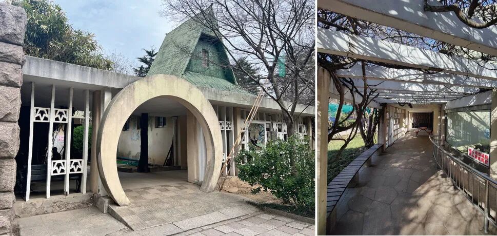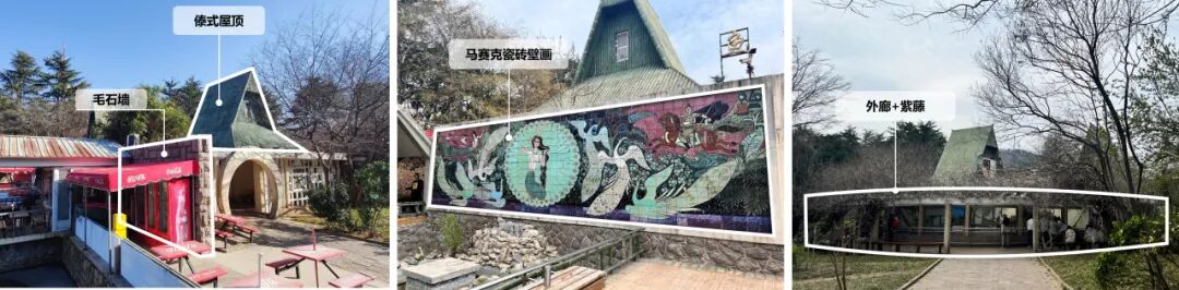 为延续场地历史记忆,设计考虑在拆除重建后仍保留傣式屋顶及毛石墙的原有元素。馆外墙面原有一幅特色鲜明、绘制精美的马赛克瓷砖壁画,承载着青岛市民的共同记忆。因此,本次改造中,我们完整保留了建筑的傣式风格神韵,将外墙那幅承载着一代人回忆的马赛克壁画在西侧绿地重建复原,让经典记忆以新形式延续。特别值得一提的是,外展场旁的紫藤廊架被完整保留,春日紫藤盛放时,这里将成为人与自然对话的绝佳场景。