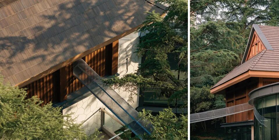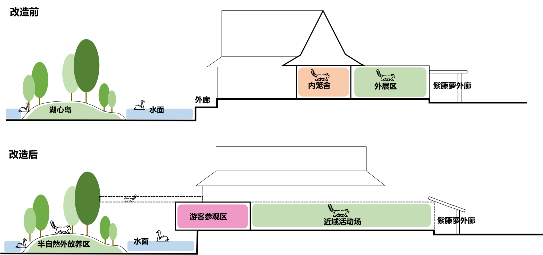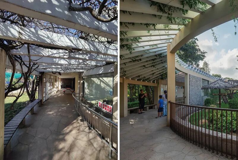作为场地核心记忆载体,原紫藤花架的结构构件与原生藤苗被完整保留并融入新馆体系。适当抬高朝向小熊猫活动区的花架梁,既扩大了动物场地的展示界面,又复原建筑紫藤廊下观赏动物的独特场景。