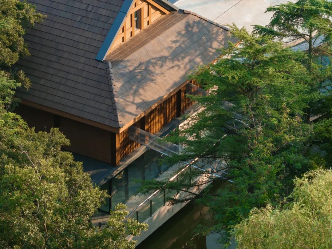 建筑立面材料采用更接近自然的木材,木瓦与仿竹造型的木饰面的使用,让建筑更具傣式建筑的韵味,竹木饰面创新的采用内凹弧面造型,既复刻竹材的天然肌理,又以当代曲线解构传统干栏意象,在光影的变化下极具美感。