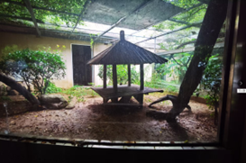 小熊猫馆初为孔雀馆,建于1982年。别致的傣族建筑风格,两座双层绿色大坡顶竹楼,混合结构,建筑面积120平方米,周围由花架回廊环抱。