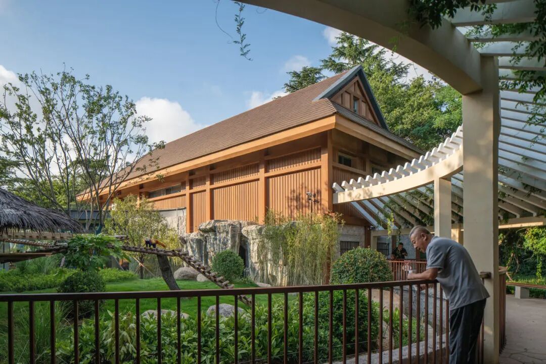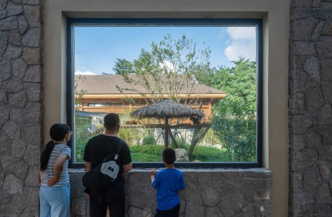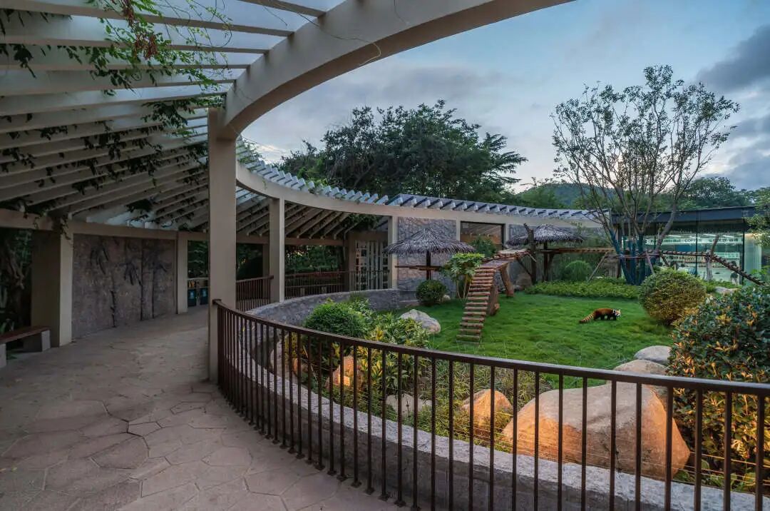 小熊猫场馆的内部丰容与外部原生环境相结合,协调统一中体现细节把控。场馆内部的丰容是基于对小熊猫的行为生物学及其自然习性的研究进行设计,空间布局、绿植山石及遮阳栖架的设置,既通过环境刺激,使小熊猫达到最佳的心理和生理健康状态,又带给游客轻松舒适的参观体验和丰富多变的观赏视角。