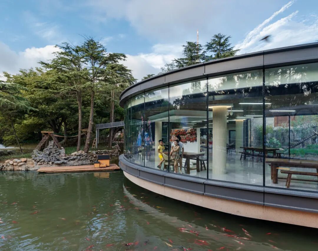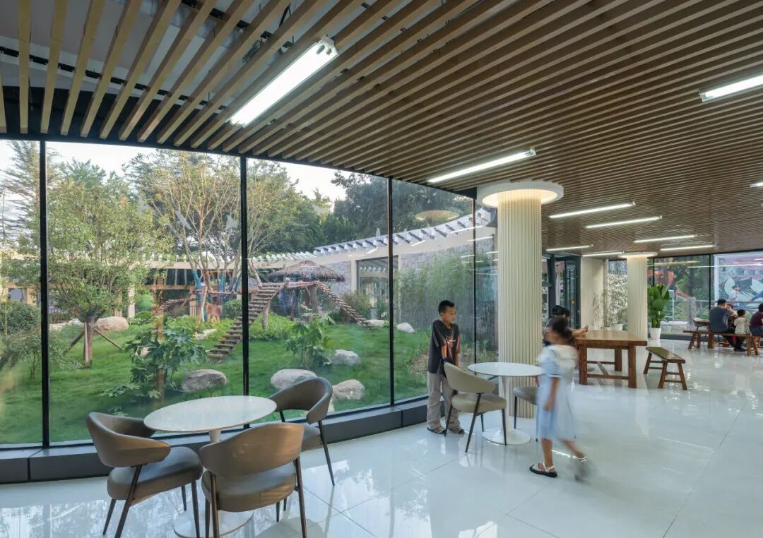设计以多维度体验叙事重构人宠关系——游客既可于紫藤廊架下凭栏观赏小熊猫在林下嬉戏,又能透过玻璃观察窗捕捉它们在栖架上休憩的慵懒剪影;移步室内咖啡区,手捧醇香咖啡静观窗外生灵跃动,自然与人文在此温柔相融。朝向湖心岛一侧,建筑预留了足够大的玻璃展面,一边可看到小熊猫湖心岛放养区,一边可以看到天鹅在湖中畅游。