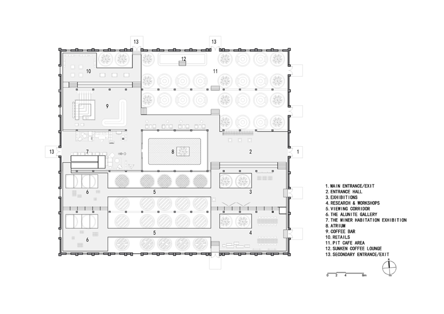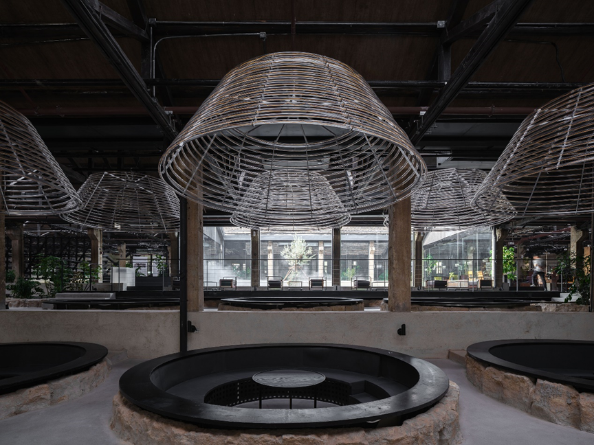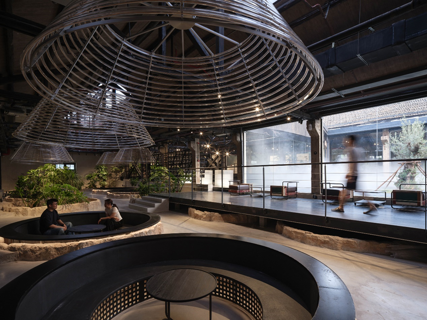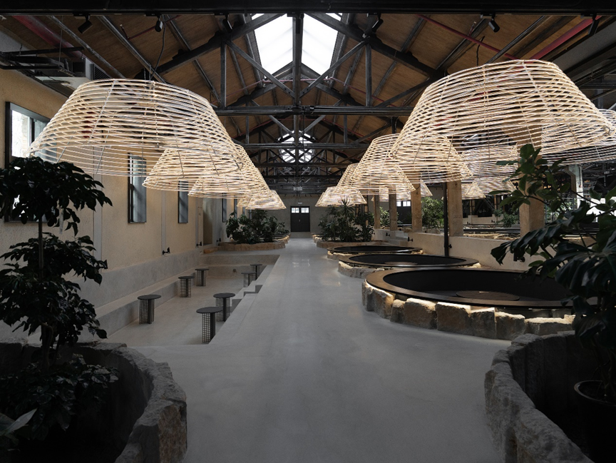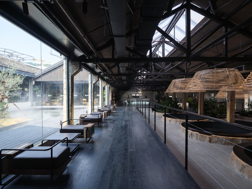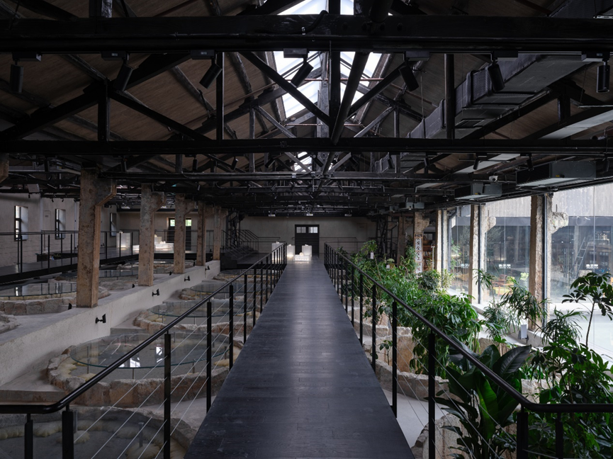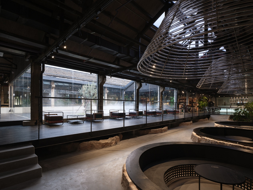 保育其形,活化其神,植入其用,最终导向的是遗址及其所在区域整体的“焕新”。这种焕新是深刻而多维的。矿坑从废墟中重生,成为充满活力、可游可赏可用的文化地标。设计的介入不止于文化层面焕发新意,更将生态修复纳入其中:巨大的圆坑,一部分置入明矾晶体重现结晶池结晶的过程,一部分形成结构脱开的咖啡区卡座,还有一部分则引入室内植物景观,化作涵养水土、孕育微小生态的“自然的容器”。在这种层层递进的更新逻辑中,工业遗址逐渐蜕变为具有生态韧性的基底。