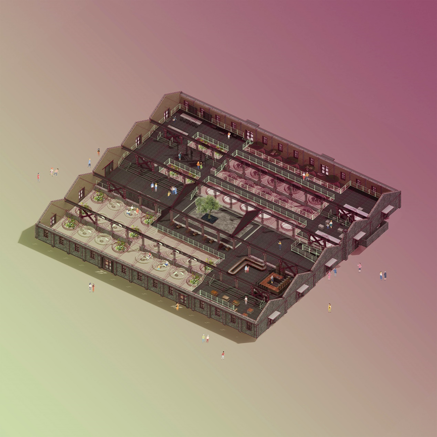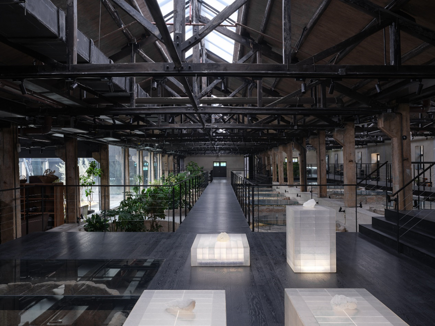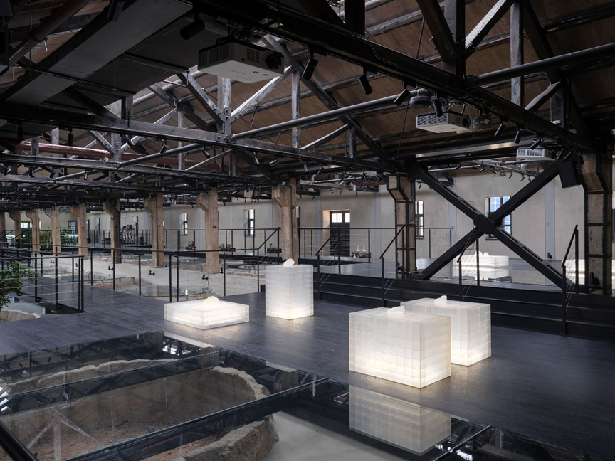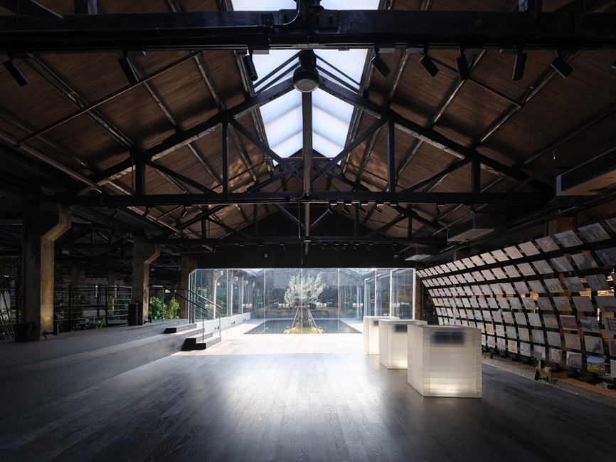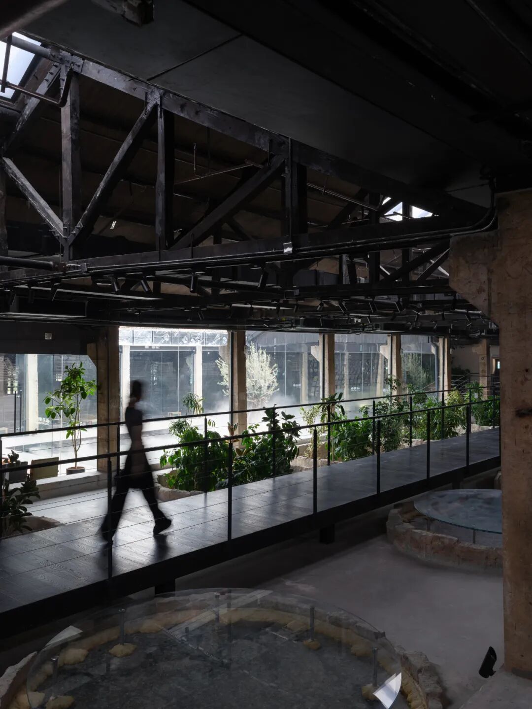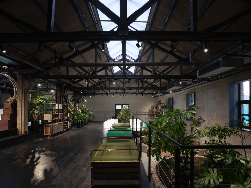 保育其形,活化其神,植入其用,最终导向的是遗址及其所在区域整体的“焕新”。这种焕新是深刻而多维的。矿坑从废墟中重生,成为充满活力、可游可赏可用的文化地标。设计的介入不止于文化层面焕发新意,更将生态修复纳入其中:巨大的圆坑,一部分置入明矾晶体重现结晶池结晶的过程,一部分形成结构脱开的咖啡区卡座,还有一部分则引入室内植物景观,化作涵养水土、孕育微小生态的“自然的容器”。在这种层层递进的更新逻辑中,工业遗址逐渐蜕变为具有生态韧性的基底。