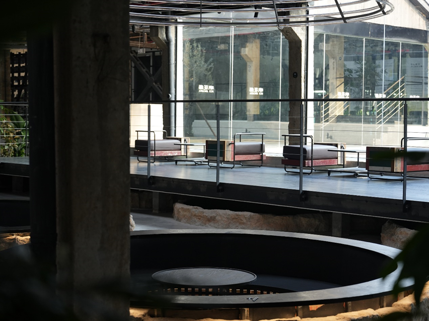 其中最具标志性的植入点莫过于选取尺度适宜的圆坑遗址,将其转化为独一无二的“矿坑咖啡”。顾客沿着栈道下行进入,坐在以晶体为灵感的透光材质的圆环形灯具装置之下,手握一杯温热咖啡,环顾着四周历经沧桑的坑壁,工业历史的厚重与当代生活的闲适在此刻奇妙交融。圆坑从被远观的遗址,变为可沉浸其中、承载当代生活场景的容器,完成了从“客体”到“主体”的身份蜕变。