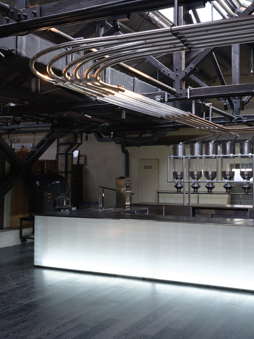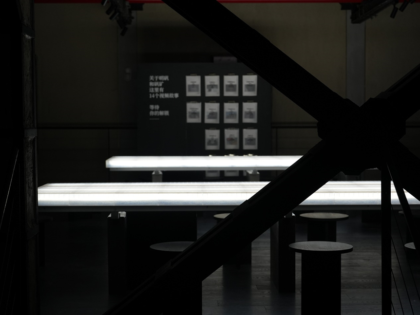展览空间中的展台、研学工坊的长桌、咖啡吧的吧台都是以手工制作的白色半透玻璃钢制成。休息区的沙发以及文创区的置物架与展台是由工作室开发设计的一套结合回收老木头、彩色磨砂亚克力和金属框架的家具系统,意在回应工业厚重质感的同时,碰撞出新与旧的对话。矿坑咖啡区每个圆坑咖啡的上方悬挂着17个经过多次实验测试的,由亚克力弯管与LED灯丝制成的3m直径的巨型灯光装置。