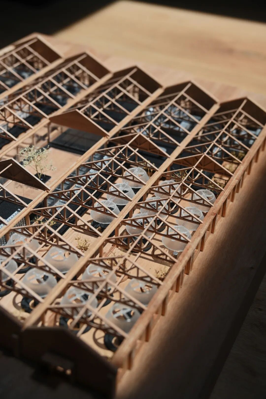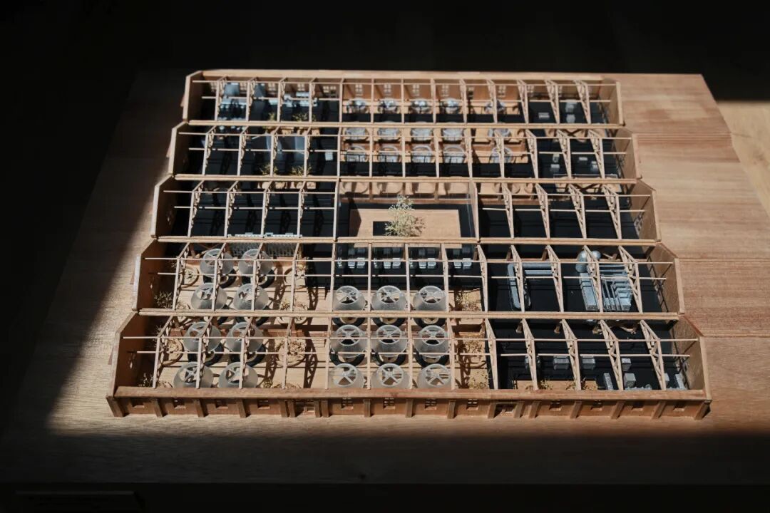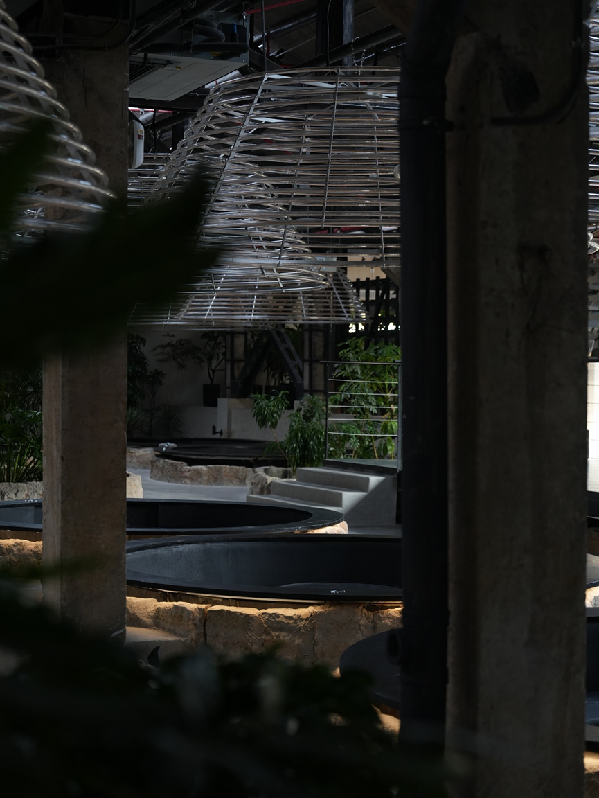 保育是贯穿始终的底线与出发点。设计以近乎考古学的严谨态度对待场地遗存。结晶池群那由历史生产活动塑造的独特的台阶型地貌,是工业过程在大地上的直接镌刻,被完整保留下来,成为整个场地最震撼的立体基座。巨大的圆坑遗址——工业流程的终端容器——其原始的、粗粝形态与坑壁赤青色的矿物渍迹一起被精心呵护。那些承载着历史信息的原有建筑结构,如建筑的木结构绗架,斑驳的混凝土框架柱与条形基础,均被最大限度地保留,在确保这些工业“骨骼”的稳定性与安全性的同时,使其得以成为后续一切活化与植入得以生根发芽的坚实土壤。