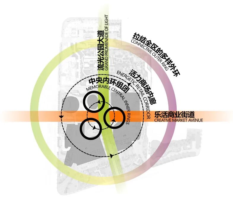 设计通过拉结全区的多样外环绿地系统,将商业、办公、居住与公园功能有机编织,延续小街廓密路网的街区肌理,形成与城市互联的柔性边界;内部则以充满记忆点的中央内环为核心,塑造承载人文故事的体验场域;同时嵌入多个活力街道,如同毛细血管般渗透连接各个地块,激发街区日常交往。