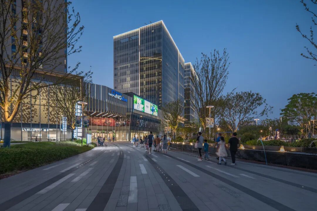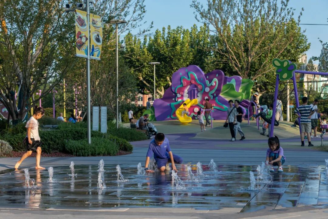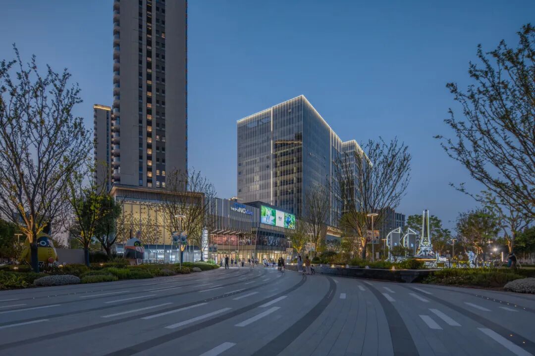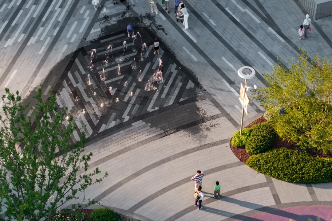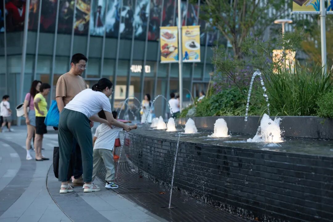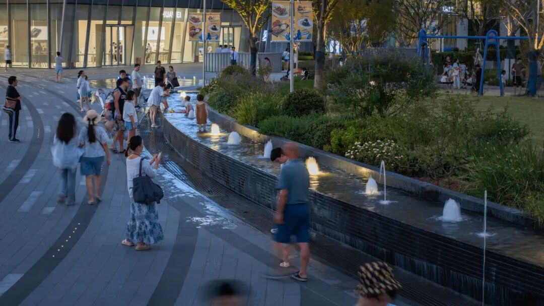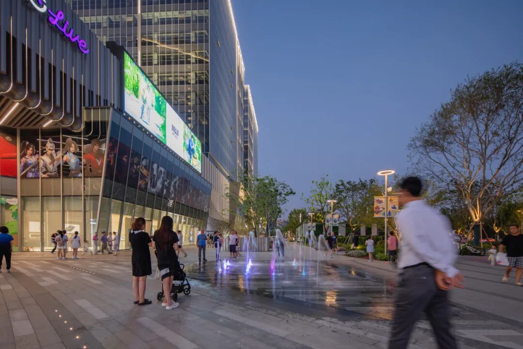 旱喷广场则通过互动性喷泉设计,在日间吸引人群聚集,夜晚结合灯光变幻成为活力舞台。以水声与光影激活场地氛围,成为连接城市与商业空间的艺术媒介。