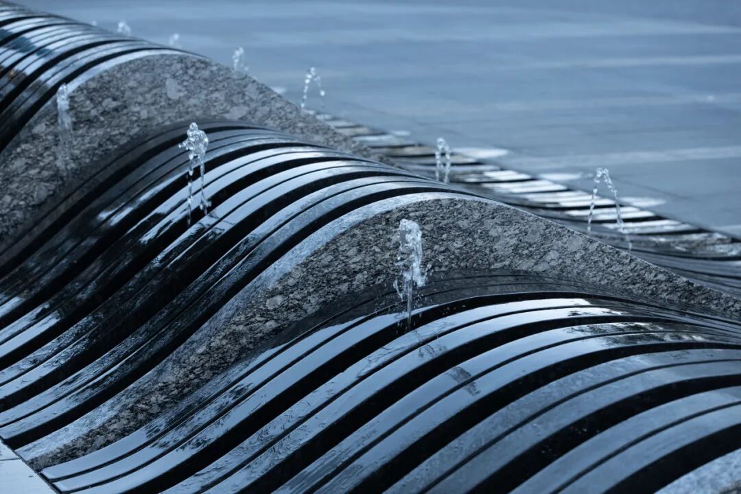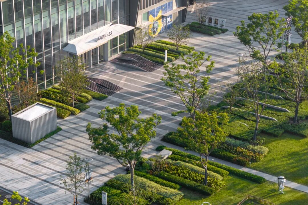 延续建筑立面的现代语汇,以不同明度的灰色铺装构成水波纹肌理,与相邻广场形成统一而富有韵律的铺装序列。流动的线条隐喻漕河泾历史水文脉络,呼应地域文化记忆。