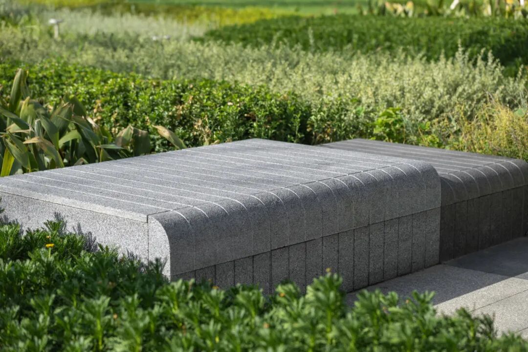 带状绿篱中嵌入多功能休闲坐凳,搭配背景的樱花林,为办公人群提供可休憩、可交流、可沉思的户外花园,实现功能与美学的有机统一。