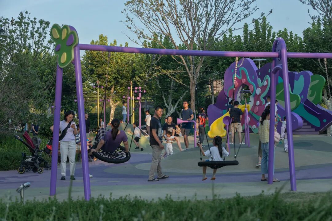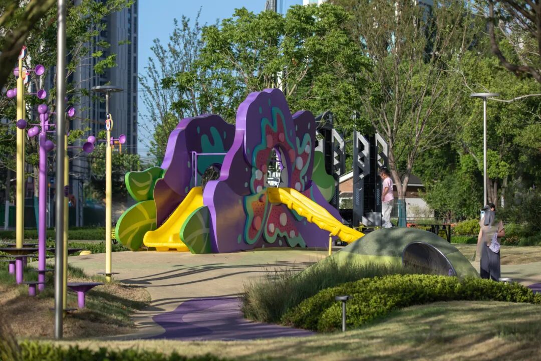 儿童活动区以"奇境花岛"为概念,打造充满自然趣味的亲子空间。花朵造型的滑梯成为视觉焦点,搭配藤蔓秋千与种子形态的摇椅,营造沉浸式自然体验。通过寓教于乐的方式,让孩童在游戏中感知自然奥秘,同时为家长提供舒适的看护休憩空间,成为社区中最具活力的亲子社交场所。