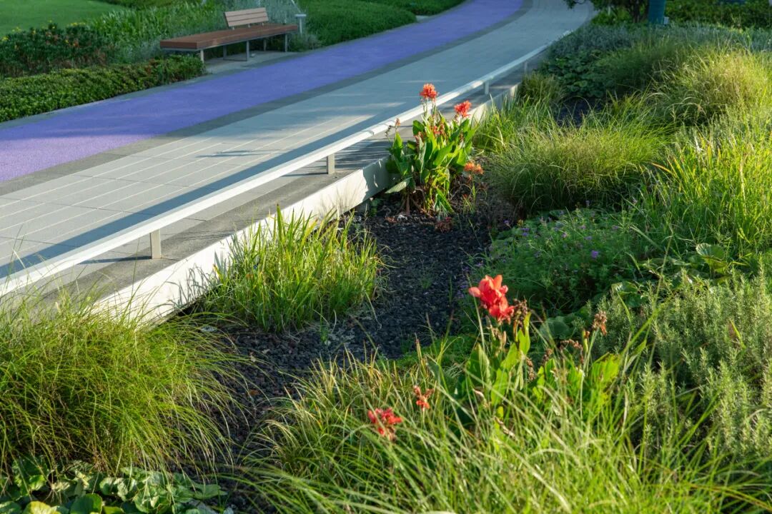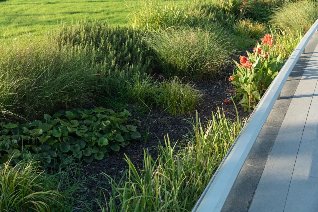 休闲绿地步道以流畅的弧线串联南侧绿地,构建沉浸式体验。步道一侧通过休闲座凳与观赏草花境打造舒适的休憩空间。"星云地被"以细叶芒等观赏草为基底,点缀鸢尾、百子莲等花卉,形成自然流动的植物组团。不同季节呈现变幻的色叶与花序景观,营造出沉浸式的自然休憩氛围。
