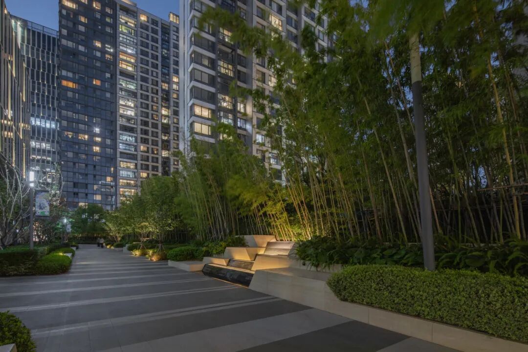 阶梯式矮墙结合层次种植,水景增添灵动气息,共同构筑静谧雅致的居住氛围,提升社区品质感与归属感。