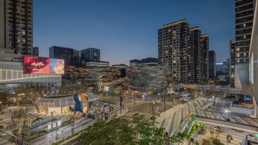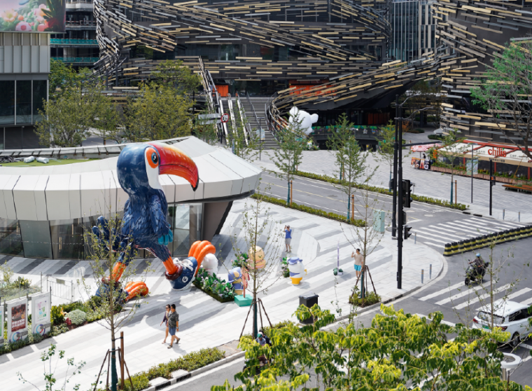 中央内环作为项目的核心精神场所,以人性化设计巧妙化解了城市道路对商业空间的割裂。通过串联南北五个地块,形成连续的步行体验环廊,不仅实现了商业资源的高效联动,更创造了激发人群停留与交往的活力磁场。设计以文化、艺术、未来三大主题构建广场群落,通过统一的铺装肌理形成强烈的空间认同感,同时在不同节点嵌入独具辨识度的艺术雕塑,使每个广场既保持整体性又独具个性。