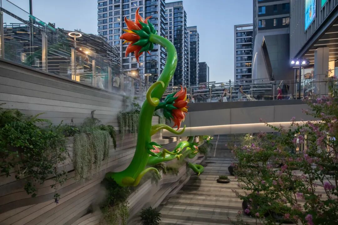 艺术化种植池与艺术装置点缀其中,形成强烈的视觉标识。针对下沉广场光照不足的特点,选用耐阴植物,打造独具特色的蕨类主题花园,在都市中心营造出一处静谧而富有生命力的绿色秘境。