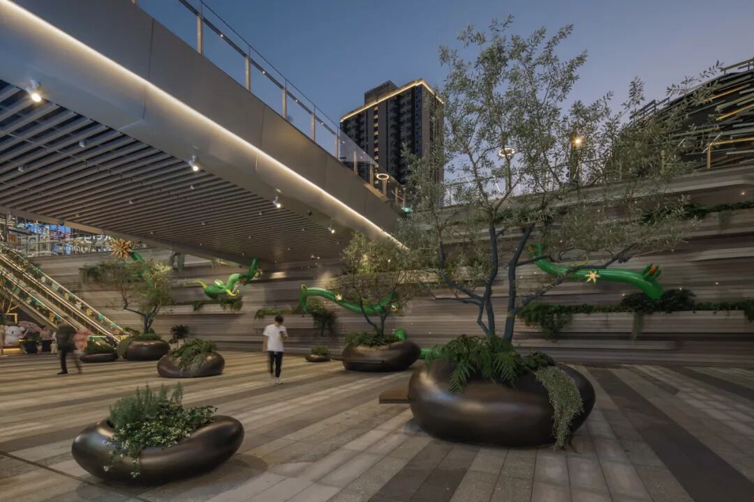 未来广场巧妙利用下沉空间的高差变化,以绿意阶梯入口、错落式休憩坐阶与层次丰富的景观看台,塑造出充满探索性的立体景观动线。
