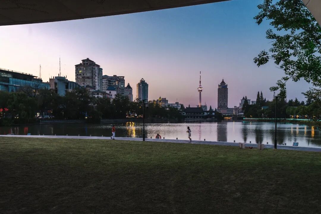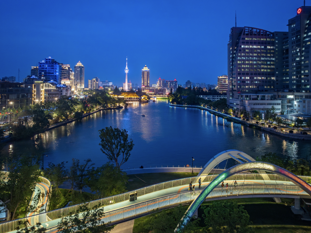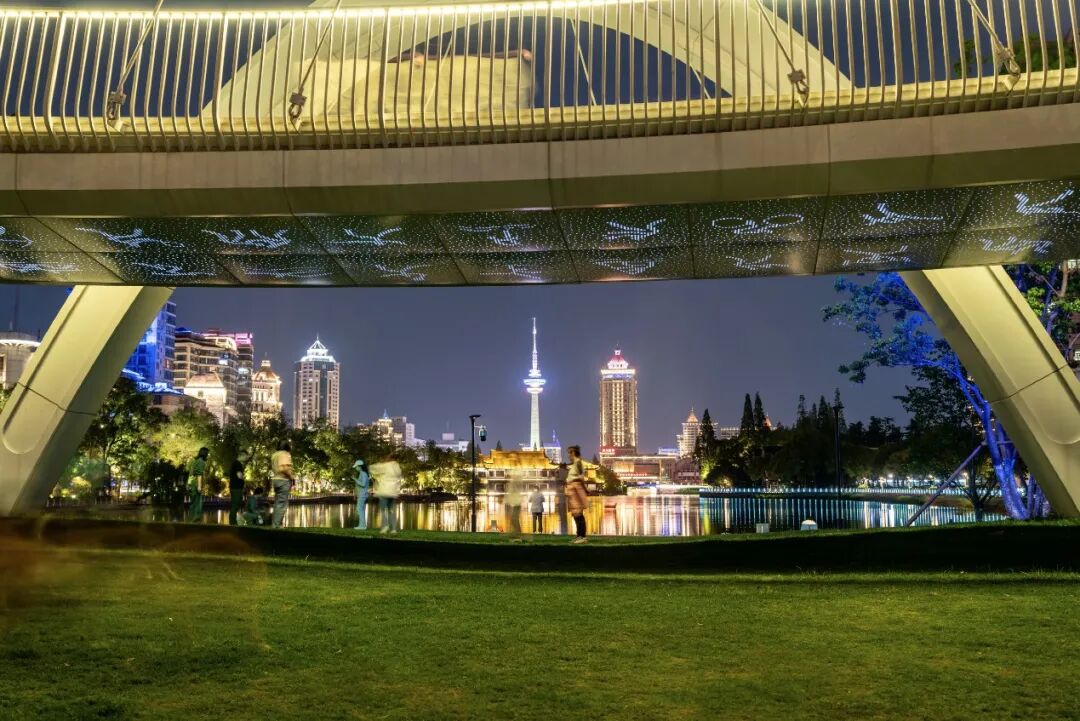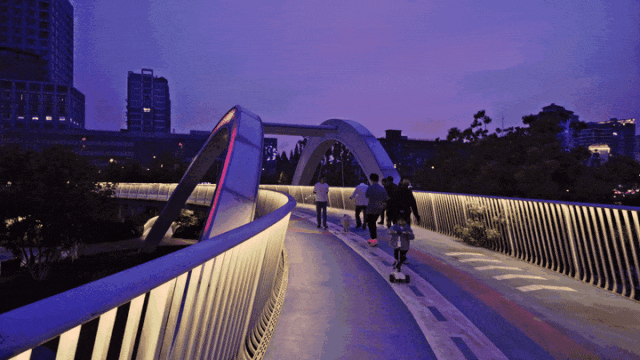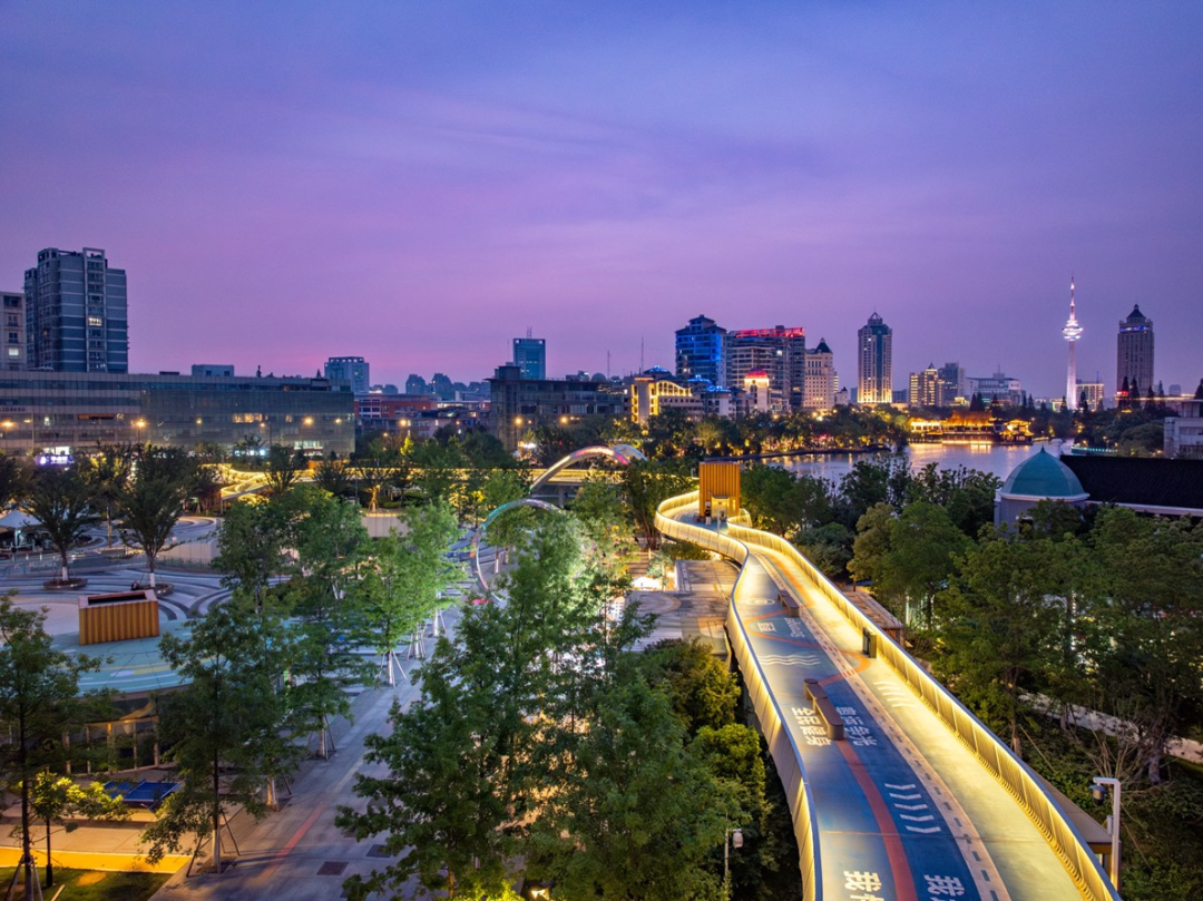待夜幕降临,泛光的拱门与“冠军摇篮”成为濠河新背景,为濠河夜景增添全新光彩,塑造焕然一新的滨水界面。