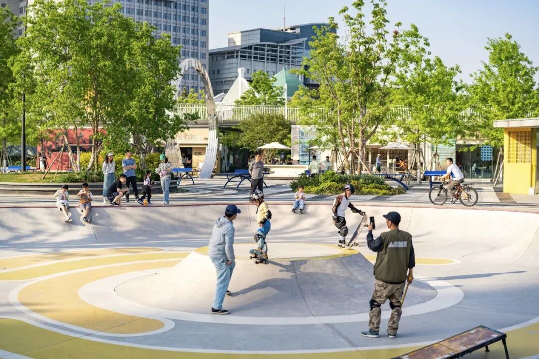 “动能多芯”区域涵盖儿童运动场、极限运动场、趣味运动场、常规运动场及下沉广场五大圆形场地。圆“芯”的设计灵感源自能量五环,通过铺砖与植被的差异化设计,形成一组相互联系又各具特色的运动场所。场地内还设置了树池座凳等休憩设施,以动静皆宜的多样空间满足市民的多元活动需求。