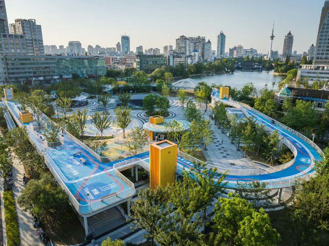 500米长的“冠军摇篮”廊桥串联整个公园,联通地下、地面与二层空间,既提升了全园的可达性又丰富了市民欣赏城市和濠河的视点空间,穿插其间的休憩、观景停留空间,让空间有更多使用可能,让使用者有更多的体验选择性。廊桥地面的趣味性铺装和奥运口号喷涂,渲染出活力四射的运动空间氛围。