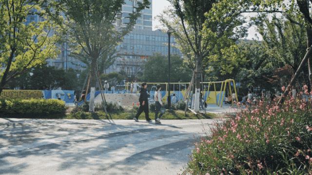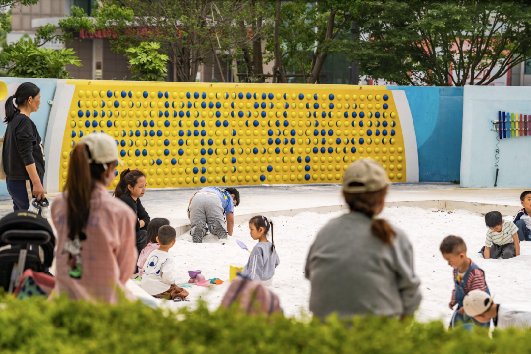 儿童运动场地临市政路一侧通过微地形、趣味墙及植物实现围合,场内配置多样化、全年龄段适配的亲子活动设施,有效吸引周边家庭参与,已成为社区社交的新兴核心场域。