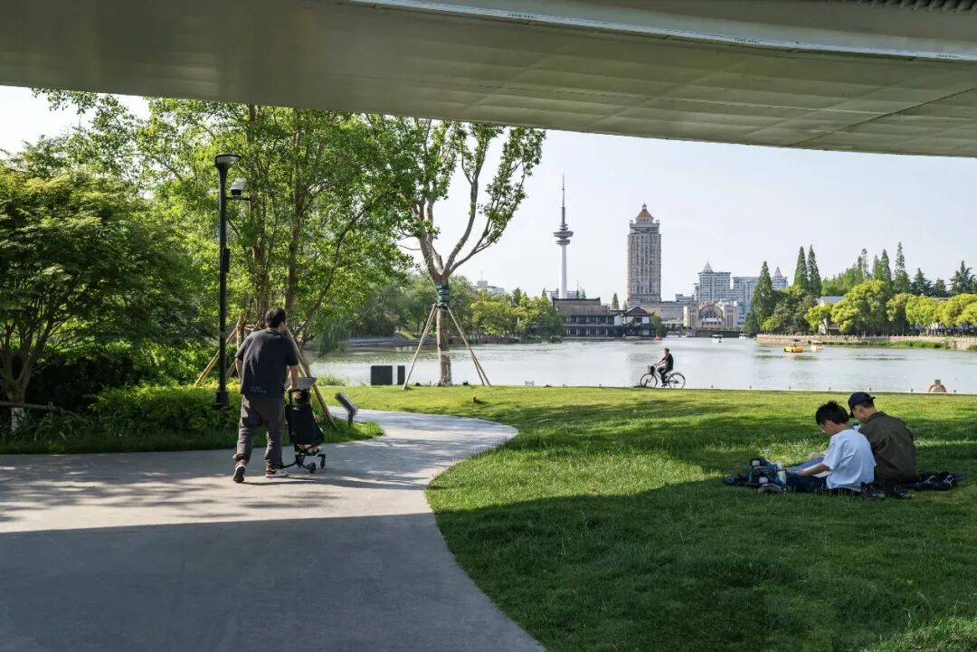 “芳草水岸”紧邻濠河。重塑后的自然亲水区保留了原有驳岸形式与码头,结合濠河风景区打造出一条滨水樱花大道,并增设亲水区域,提高场地亲水性;结合毗邻“冠军大道”的约1500平方米弹性草坪,形成观景、休闲、社交于一体的滨水活动区,同时也为日后举办公共活动与庆典预留了空间。