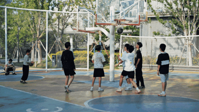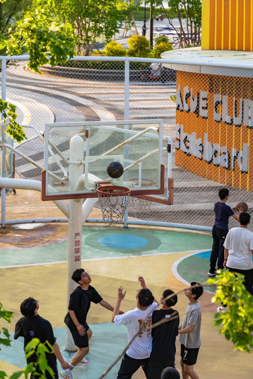 在场地东南角的小型街头篮球场上,篮球爱好者们在这里挥洒汗水。