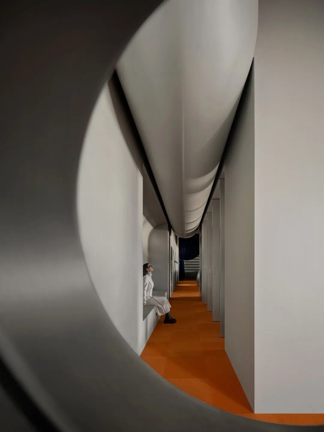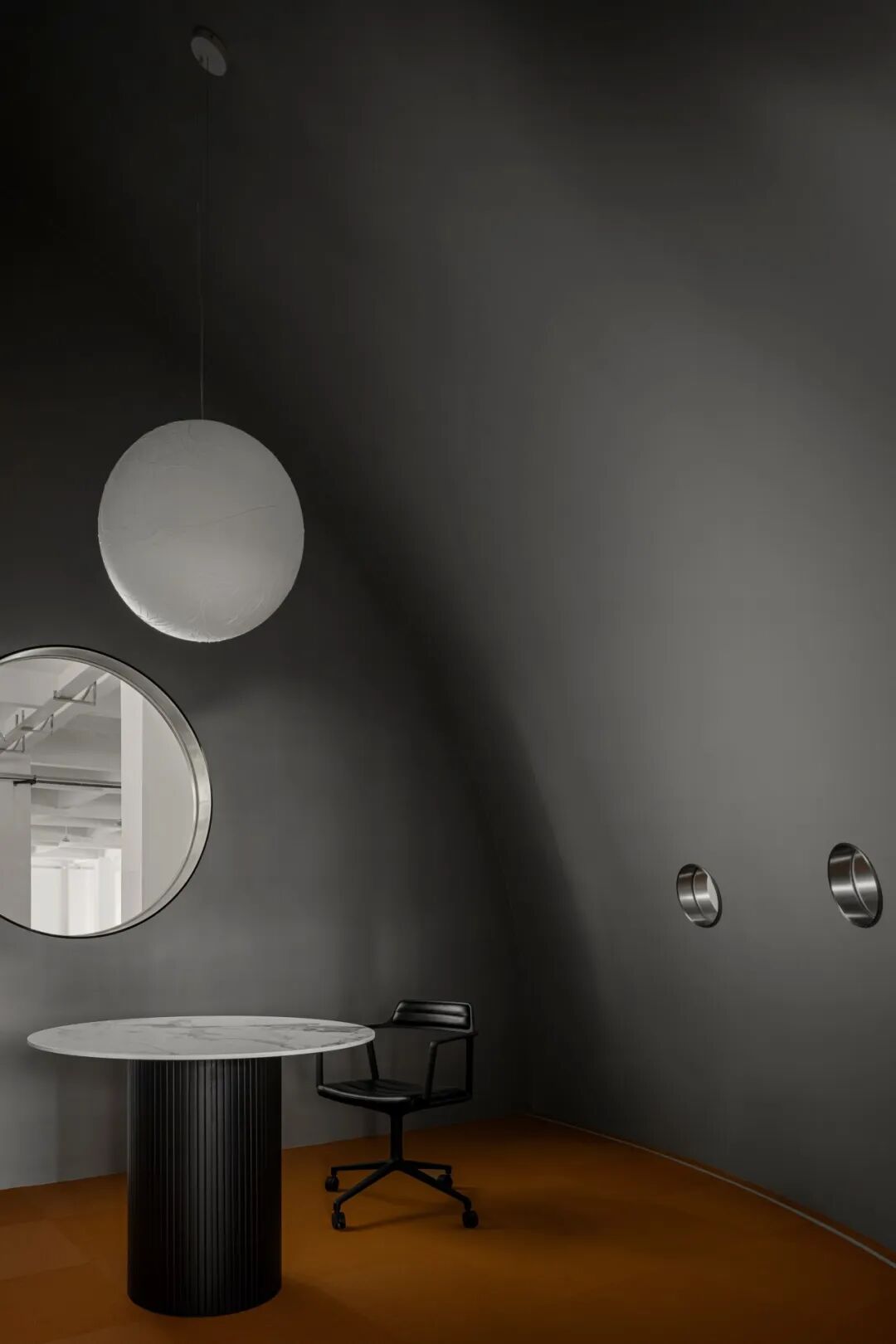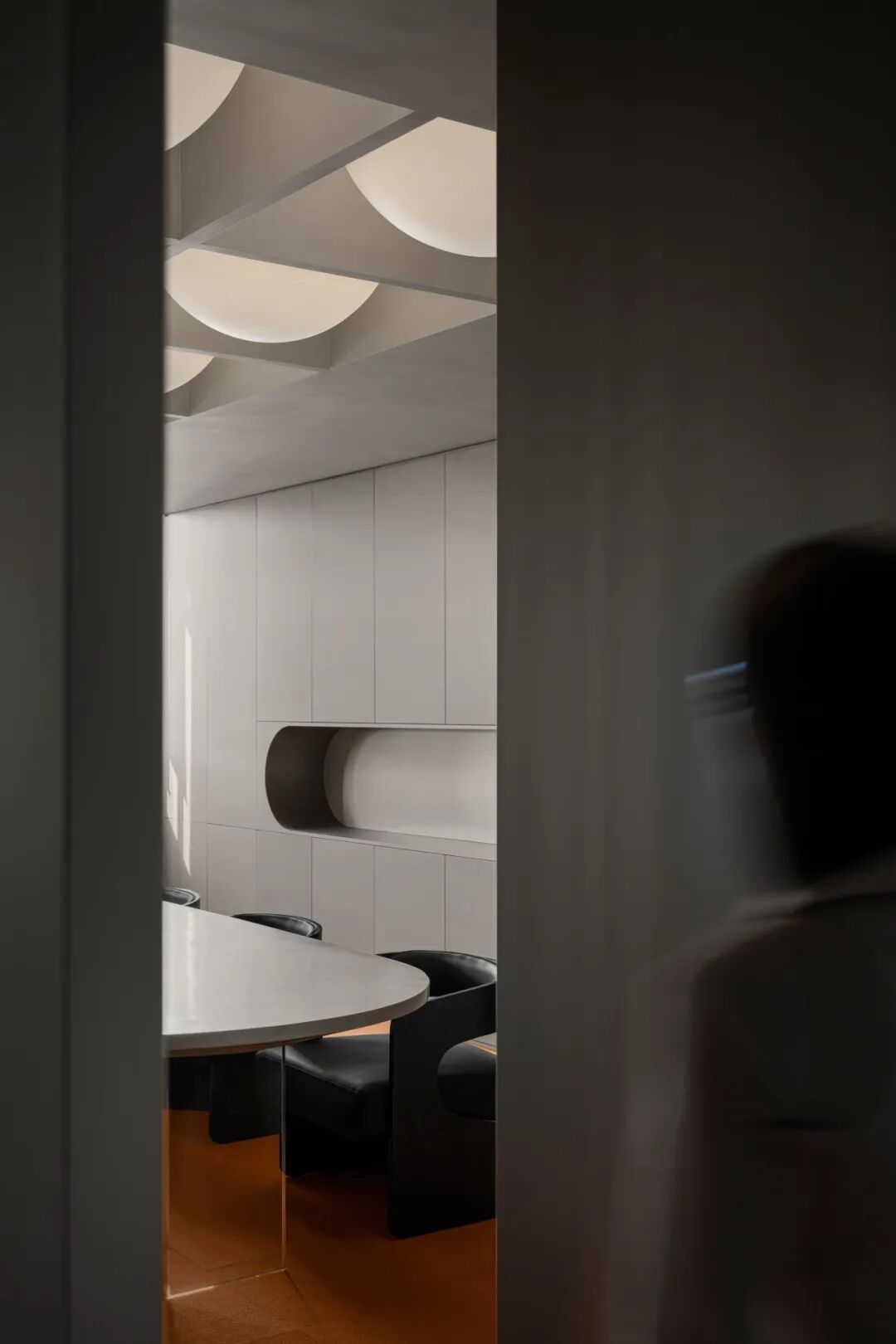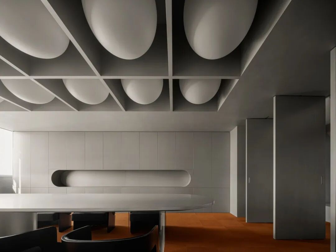 球体元素在空间中多重呈现,并以充满力量感的方式表达。社交前厅中,天花板上仿佛悬垂一颗巨大球体,将顶面压成弧形;其下方对应一处被切割为圆环形的座椅结构,形成上下呼应。绒球与星球之间“轻与重”的对比,既戏剧化地还原了绒球意象,也隐喻了企业的核心业务。