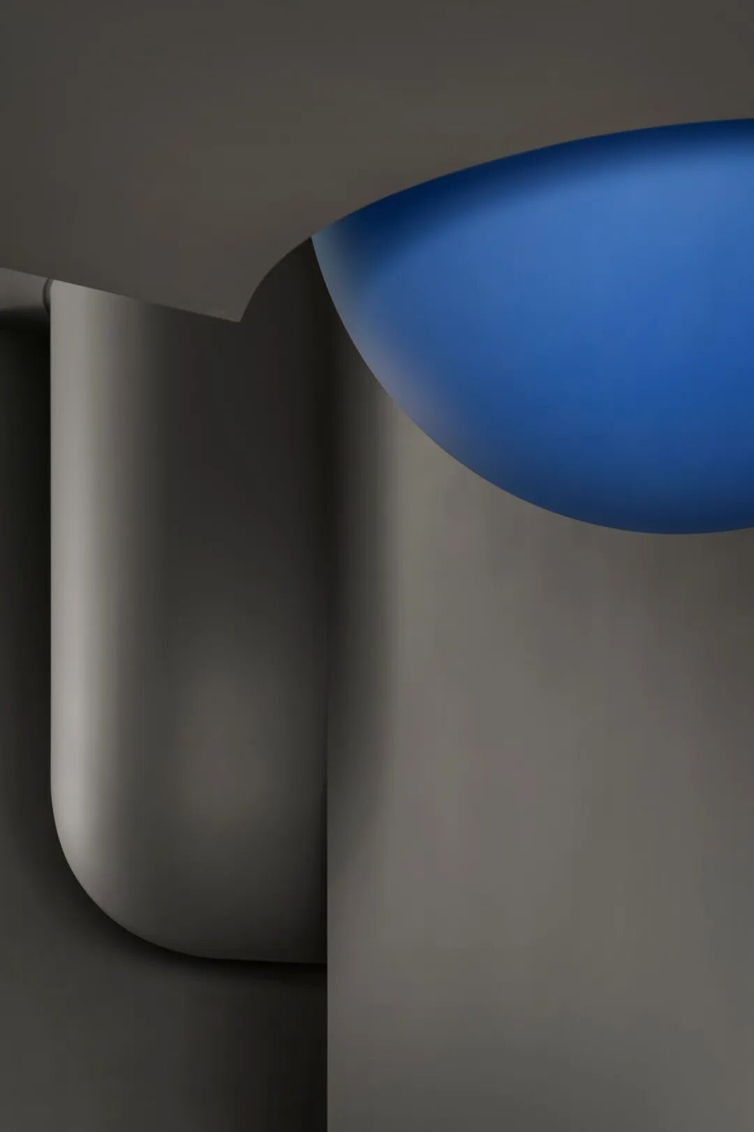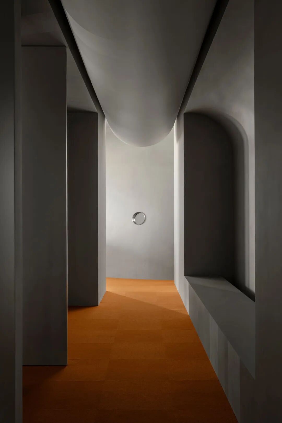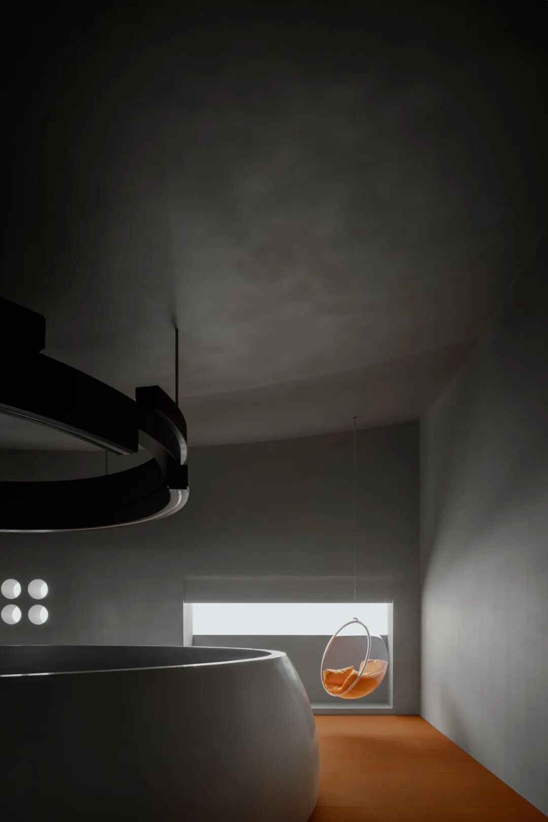 球体元素在空间中多重呈现,并以充满力量感的方式表达。社交前厅中,天花板上仿佛悬垂一颗巨大球体,将顶面压成弧形;其下方对应一处被切割为圆环形的座椅结构,形成上下呼应。绒球与星球之间“轻与重”的对比,既戏剧化地还原了绒球意象,也隐喻了企业的核心业务。