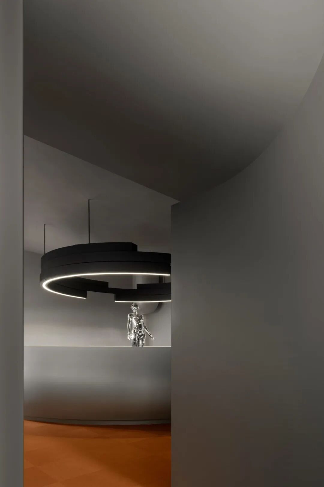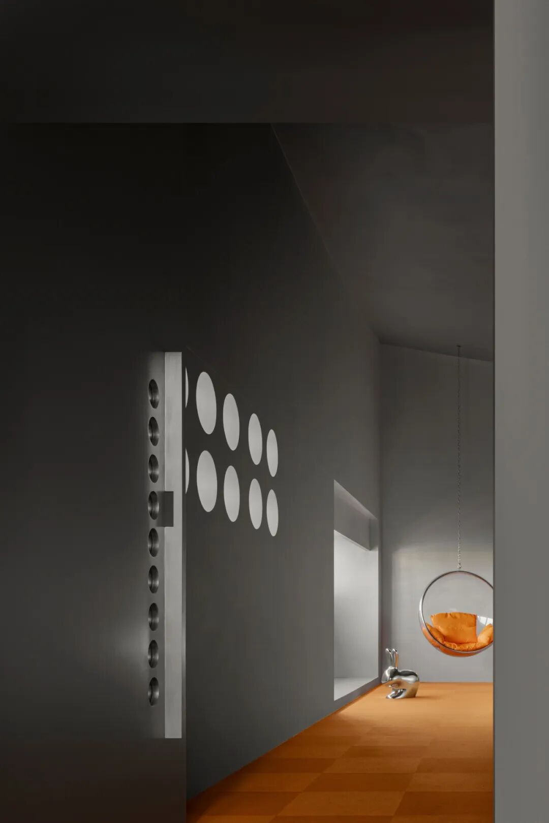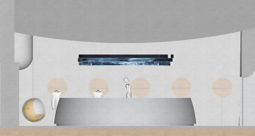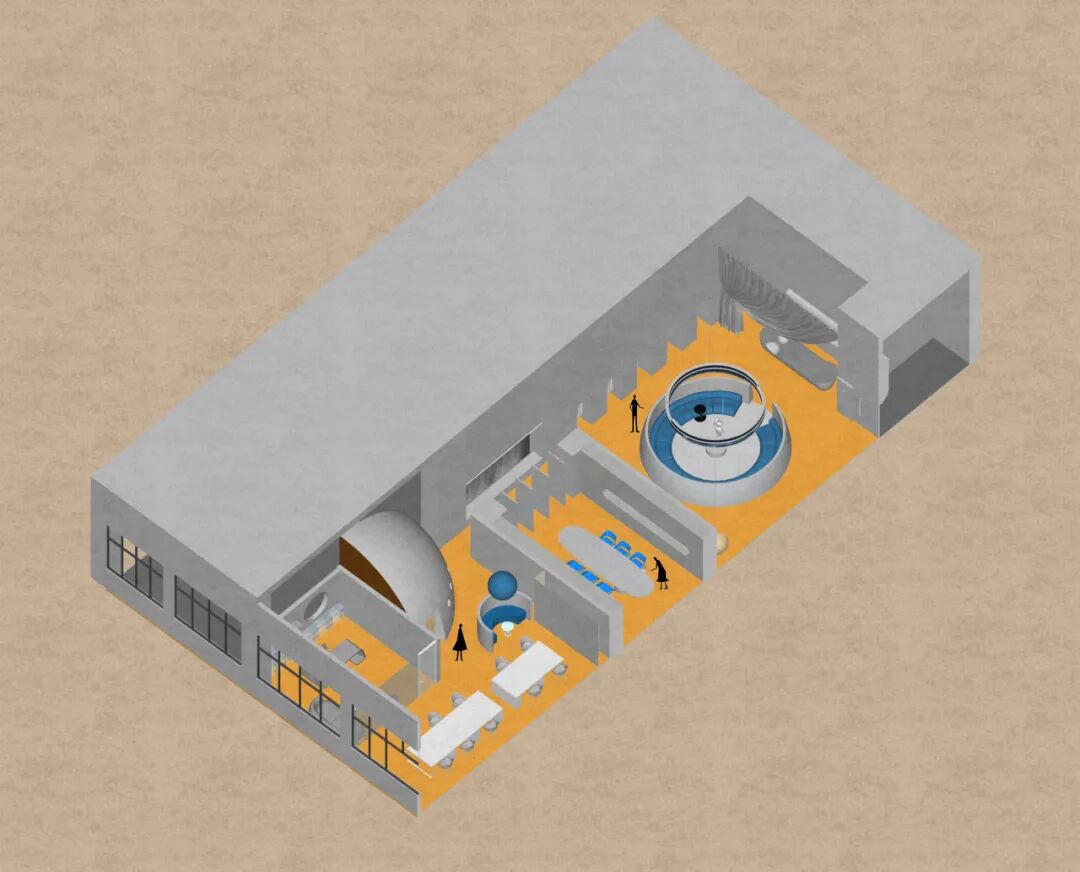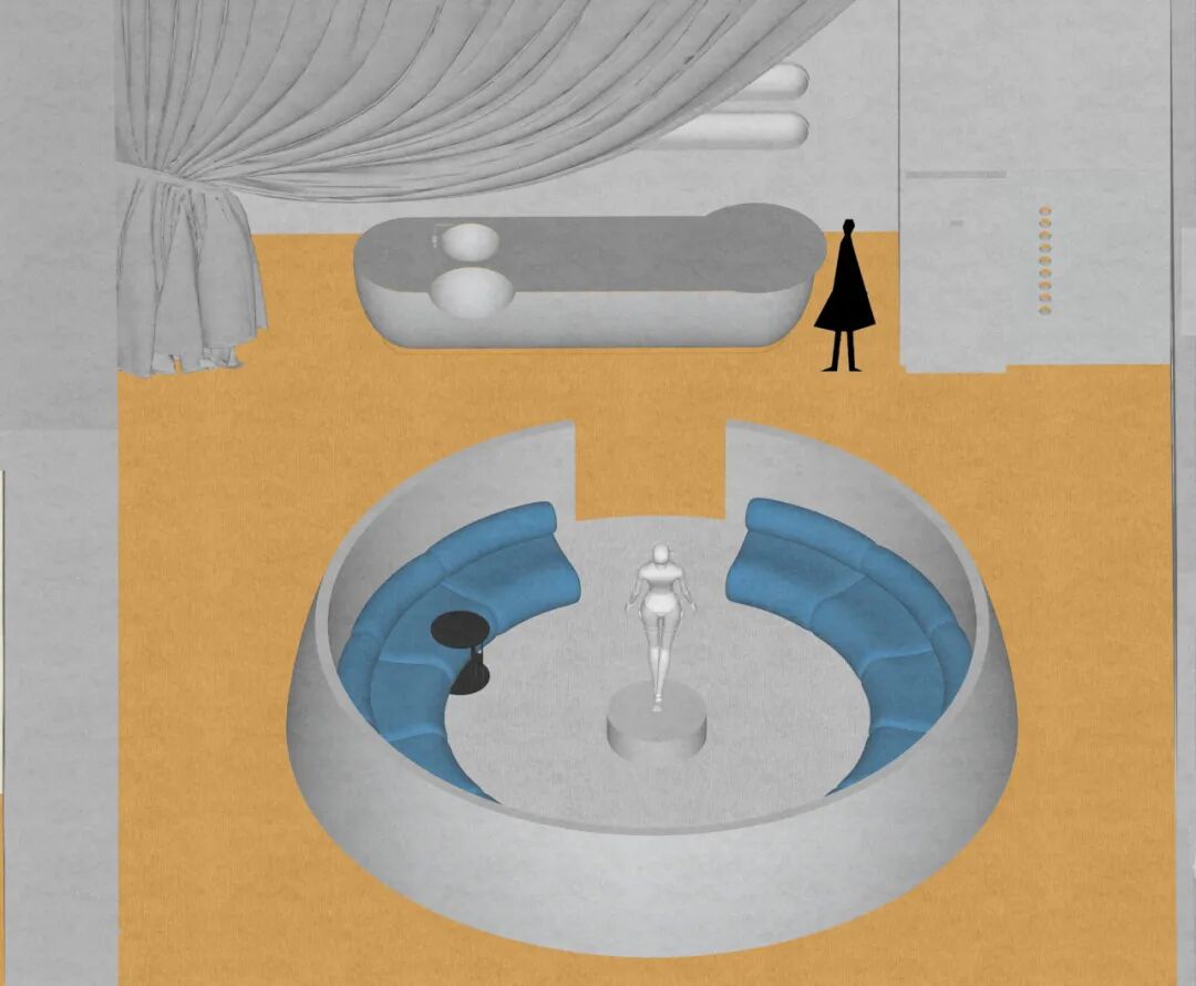 为传递“科技感”与“未来主义”,空间大量使用银色金属漆,其冷调光泽营造出星际空间般的视觉氛围,紧扣“未来星球”主题。然而绒面本身具有温暖特质,为此,设计师巧妙融入高饱和度的橙、蓝色调。尤其是橙色地毯的运用,模拟出绒面布料的柔软触感,从视觉与触觉两个维度平衡了空间情绪。