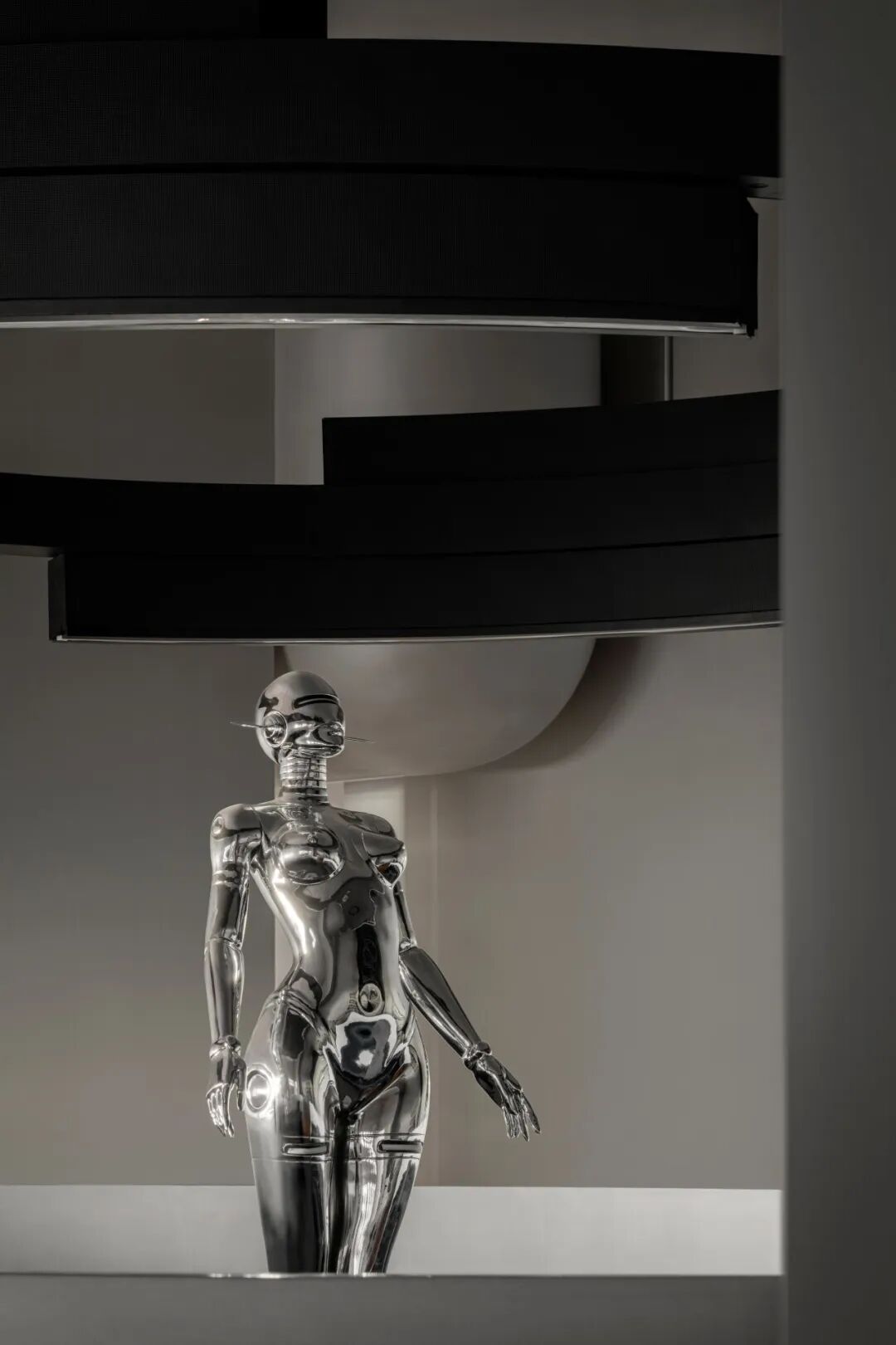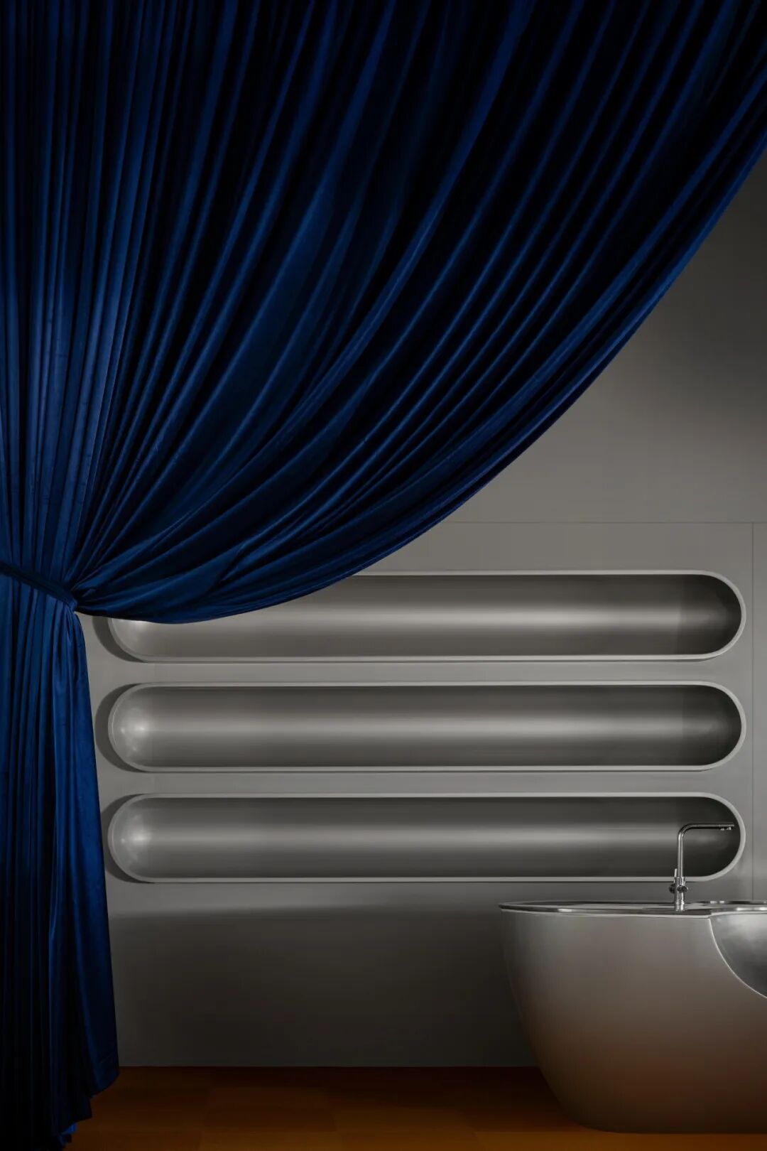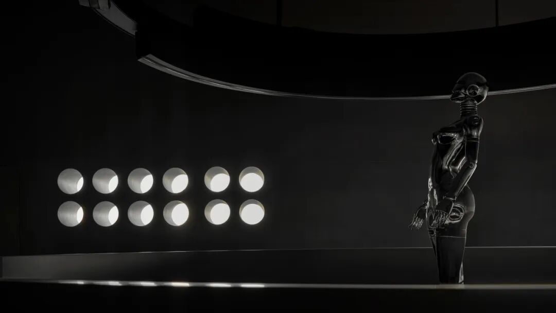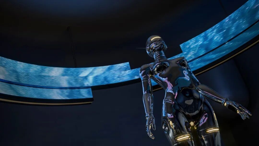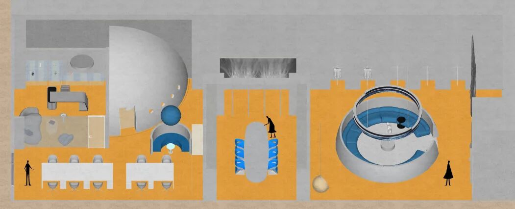 为传递“科技感”与“未来主义”,空间大量使用银色金属漆,其冷调光泽营造出星际空间般的视觉氛围,紧扣“未来星球”主题。然而绒面本身具有温暖特质,为此,设计师巧妙融入高饱和度的橙、蓝色调。尤其是橙色地毯的运用,模拟出绒面布料的柔软触感,从视觉与触觉两个维度平衡了空间情绪。