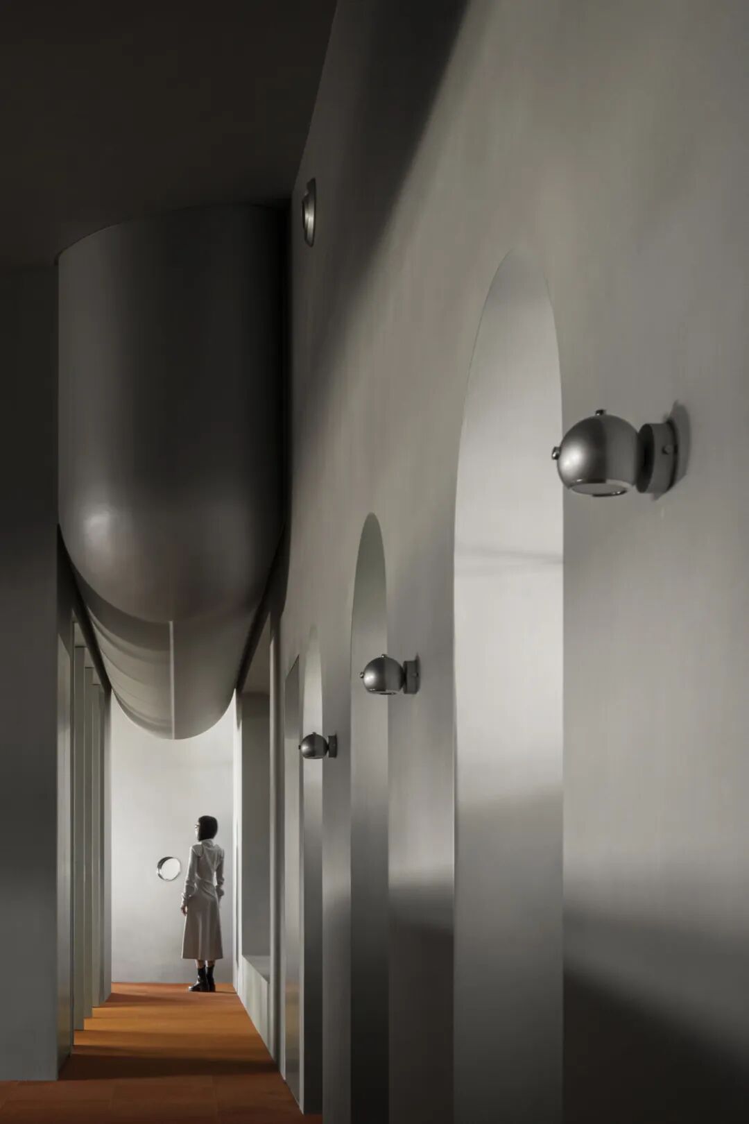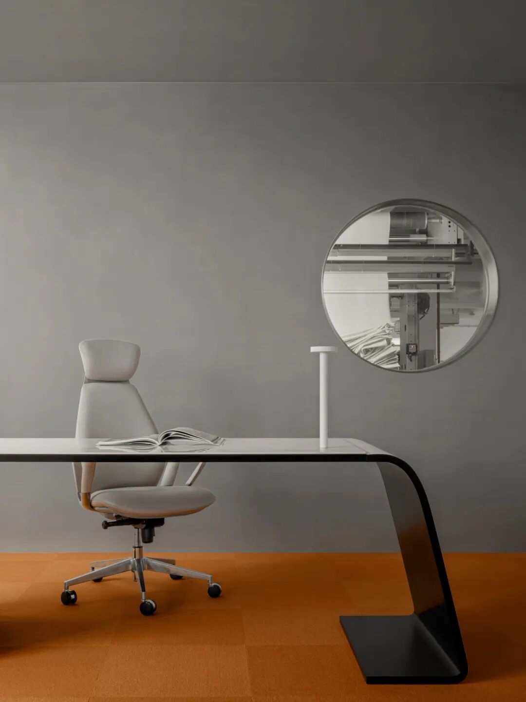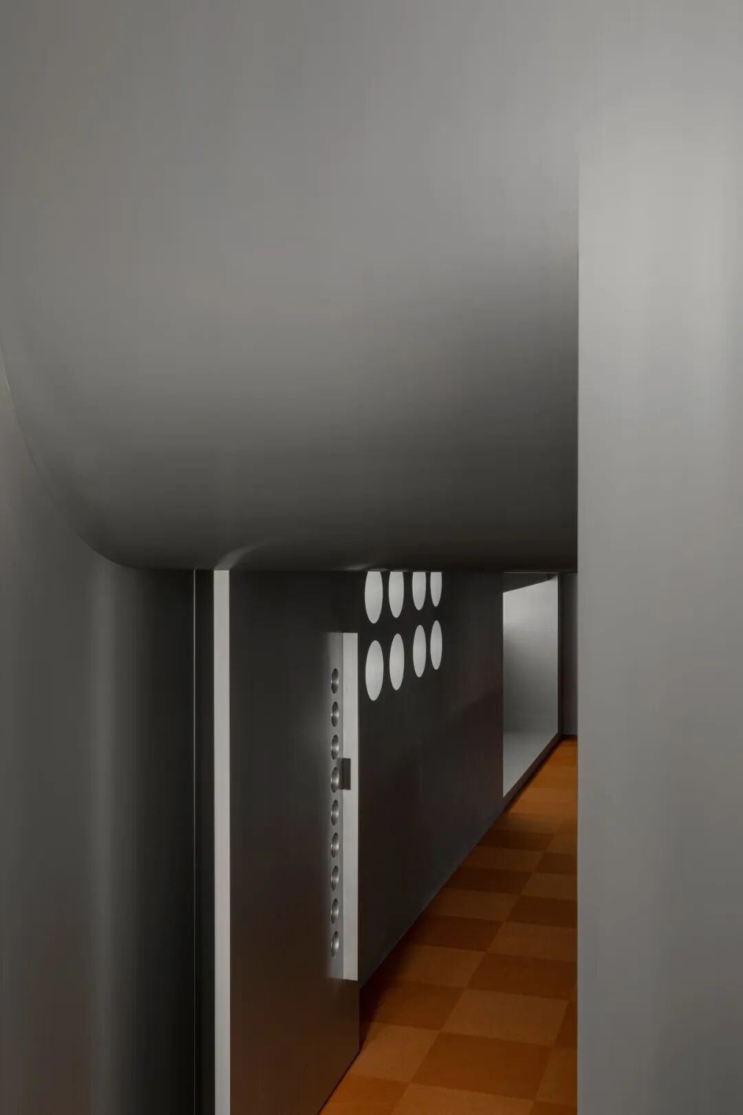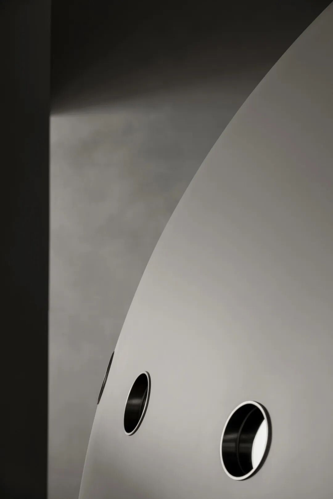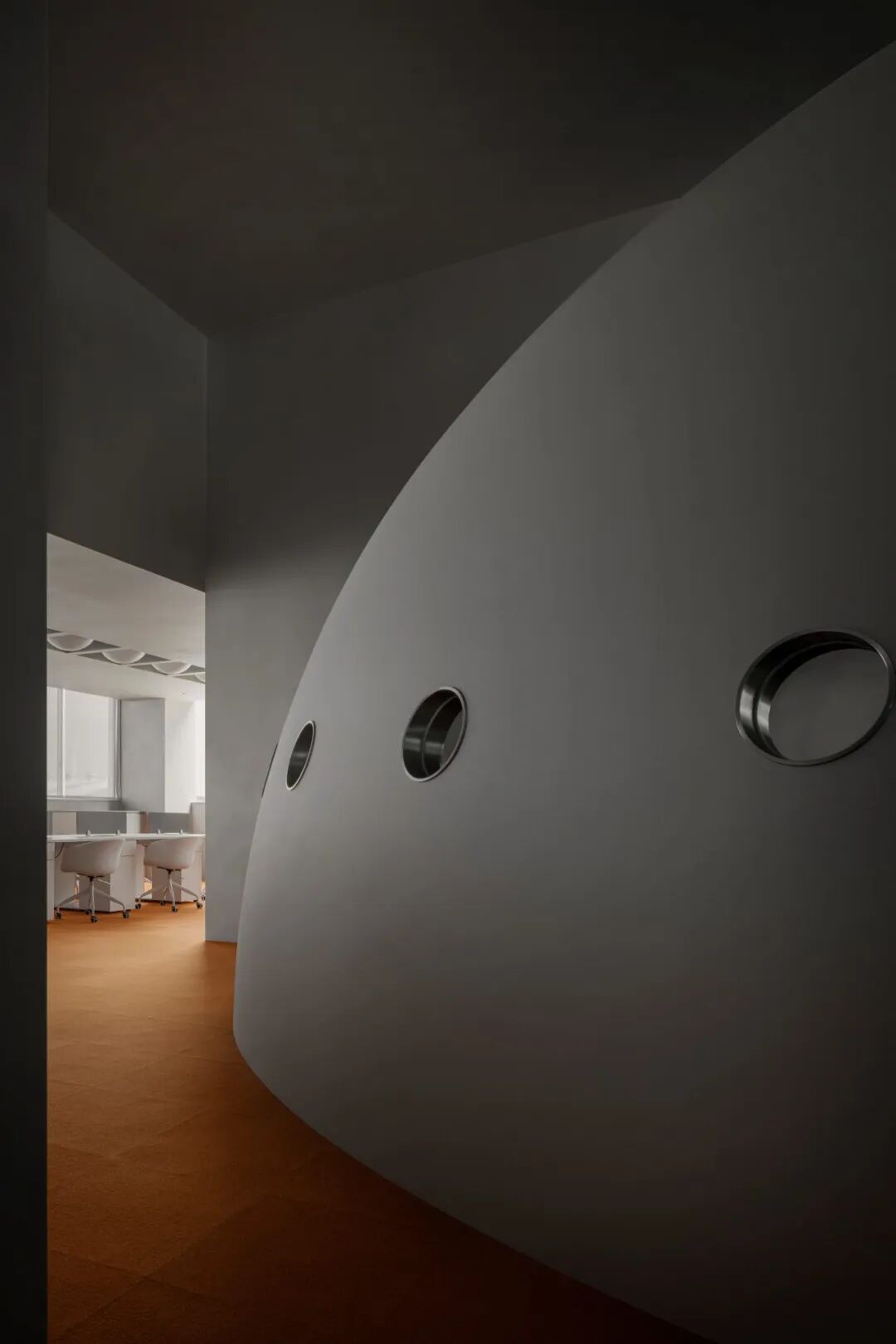 办公区位于厂房二层,与生产车间仅一墙之隔。设计通过“挖洞”手法,在墙体开辟出一系列圆形窗洞,使办公人员可直观看到车间设备的运转。这一设计不仅增添空间趣味,更模糊了办公与生产区域的界限,凸显企业开放、透明的文化理念。