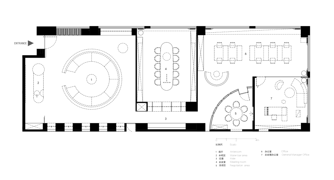 在空间动线上,依序规划为:社交大厅 → 会议室 → 洽谈区 → 开放办公区 → 独立办公室。通过流畅的视觉引导与功能衔接,实现从开放到私密的自然过渡,既保障工作效率,也鼓励协作发生。